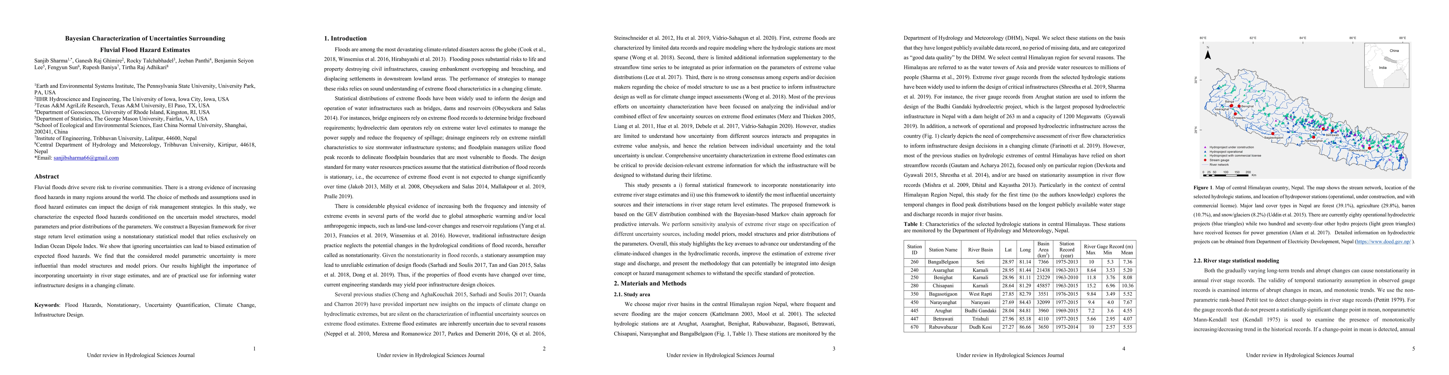 This paper develops a Bayesian framework to assess uncertainties in fluvial flood hazard estimates, emphasizing the impact of model parametric uncertainty over model structures and priors. It underscores the necessity of incorporating uncertainty for effective water infrastructure design in a changing climate.