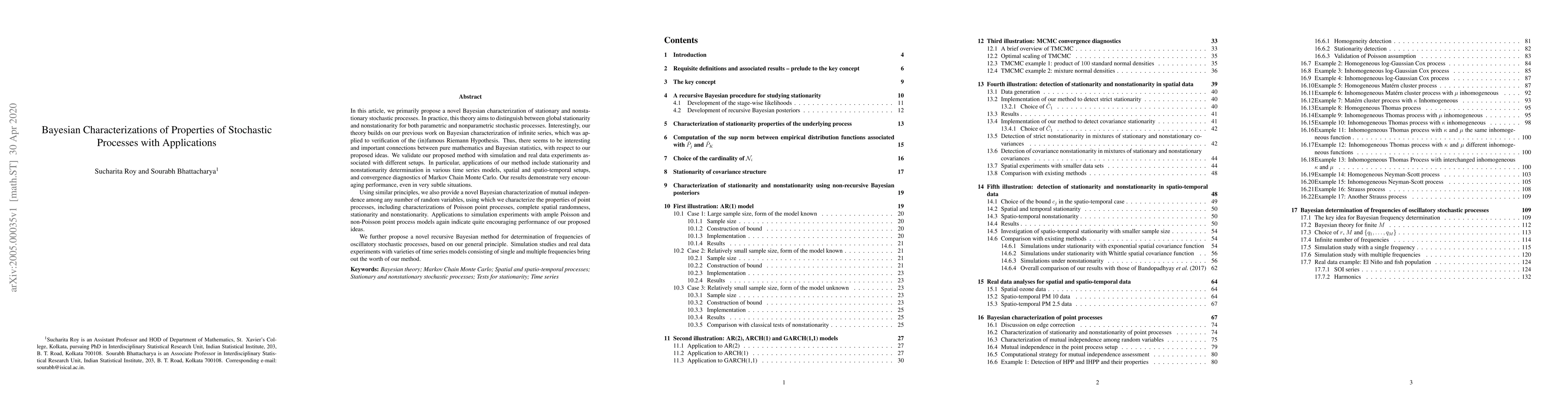 In this article, we primarily propose a novel Bayesian characterization of stationary and nonstationary stochastic processes. In practice, this theory aims to distinguish between global stationarity and nonstationarity for both parametric and nonparametric stochastic processes. Interestingly, our theory builds on our previous work on Bayesian characterization of infinite series, which was applied to verification of the (in)famous Riemann Hypothesis. Thus, there seems to be interesting and important connections between pure mathematics and Bayesian statistics, with respect to our proposed ideas. We validate our proposed method with simulation and real data experiments associated with different setups. In particular, applications of our method include stationarity and nonstationarity determination in various time series models, spatial and spatio-temporal setups, and convergence diagnostics of Markov Chain Monte Carlo. Our results demonstrate very encouraging performance, even in very subtle situations. Using similar principles, we also provide a novel Bayesian characterization of mutual independence among any number of random variables, using which we characterize the properties of point processes, including characterizations of Poisson point processes, complete spatial randomness, stationarity and nonstationarity. Applications to simulation experiments with ample Poisson and non-Poisson point process models again indicate quite encouraging performance of our proposed ideas. We further propose a novel recursive Bayesian method for determination of frequencies of oscillatory stochastic processes, based on our general principle. Simulation studies and real data experiments with varieties of time series models consisting of single and multiple frequencies bring out the worth of our method.