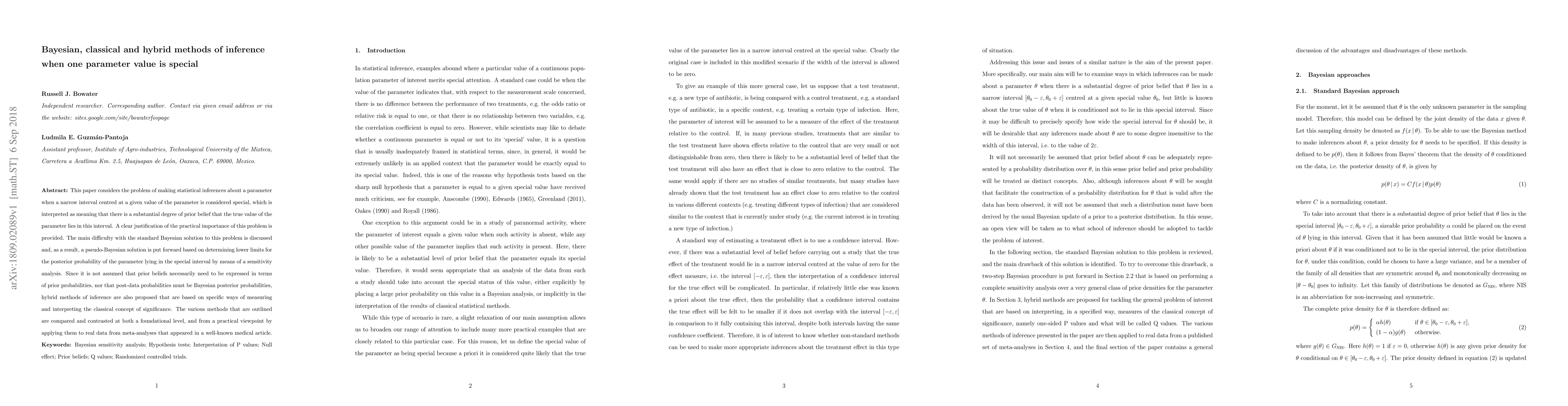 Researchers propose new methods for statistical inference when a parameter's value is considered special due to prior belief in its narrow interval, offering pseudo-Bayesian and hybrid solutions that focus on lower limit posteriors and classical significance measurements.