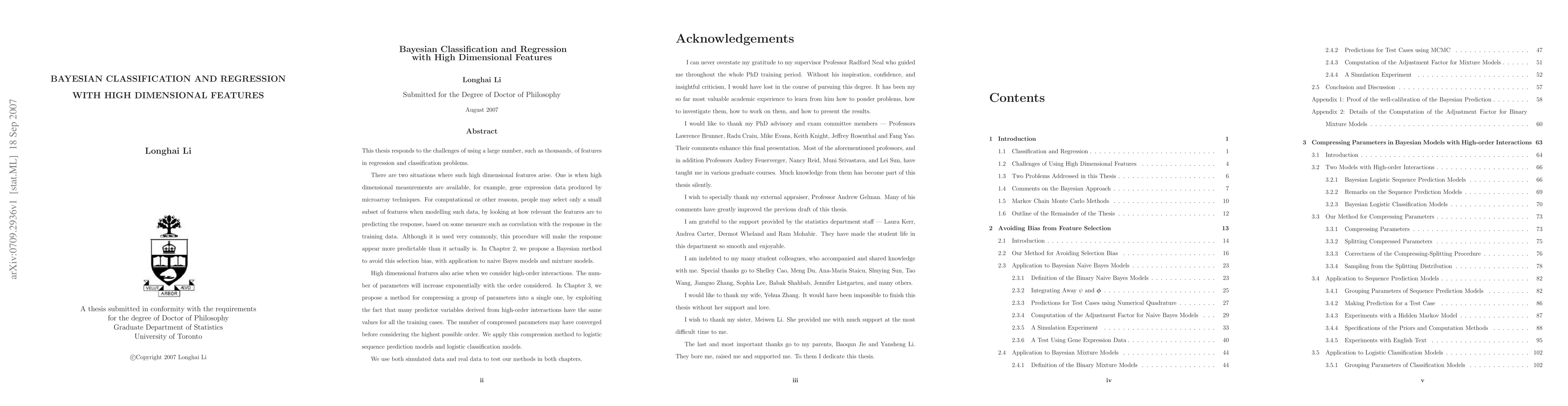 This thesis responds to the challenges of using a large number, such as thousands, of features in regression and classification problems. There are two situations where such high dimensional features arise. One is when high dimensional measurements are available, for example, gene expression data produced by microarray techniques. For computational or other reasons, people may select only a small subset of features when modelling such data, by looking at how relevant the features are to predicting the response, based on some measure such as correlation with the response in the training data. Although it is used very commonly, this procedure will make the response appear more predictable than it actually is. In Chapter 2, we propose a Bayesian method to avoid this selection bias, with application to naive Bayes models and mixture models. High dimensional features also arise when we consider high-order interactions. The number of parameters will increase exponentially with the order considered. In Chapter 3, we propose a method for compressing a group of parameters into a single one, by exploiting the fact that many predictor variables derived from high-order interactions have the same values for all the training cases. The number of compressed parameters may have converged before considering the highest possible order. We apply this compression method to logistic sequence prediction models and logistic classification models. We use both simulated data and real data to test our methods in both chapters.