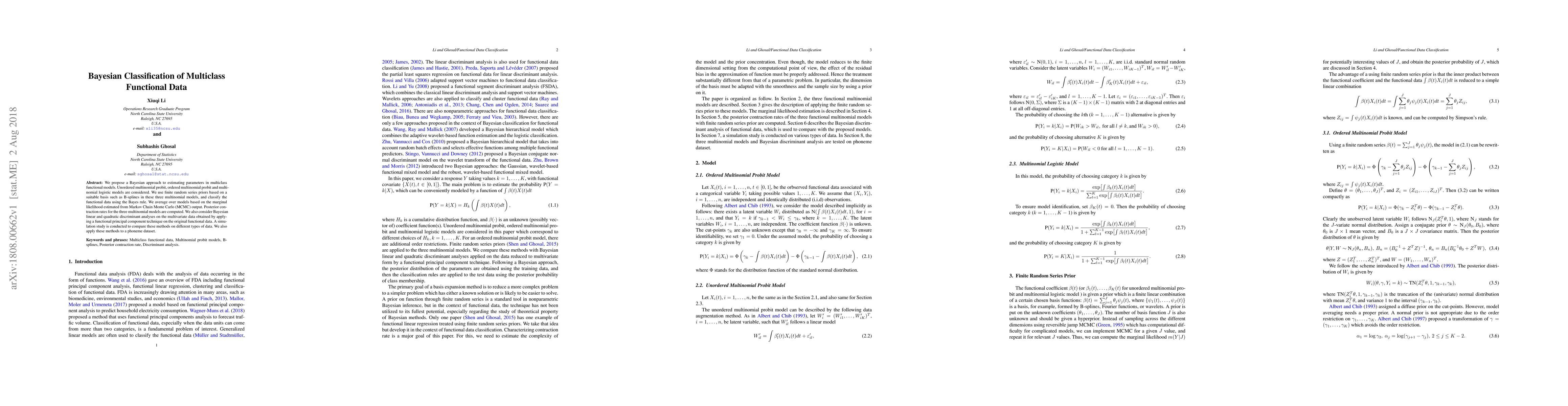 This paper introduces a Bayesian method for classifying multiclass functional data using finite random series priors and various multinomial probit models. The approach employs Markov Chain Monte Carlo for estimating marginal likelihoods and includes a simulation study and application to a phoneme dataset for validation.