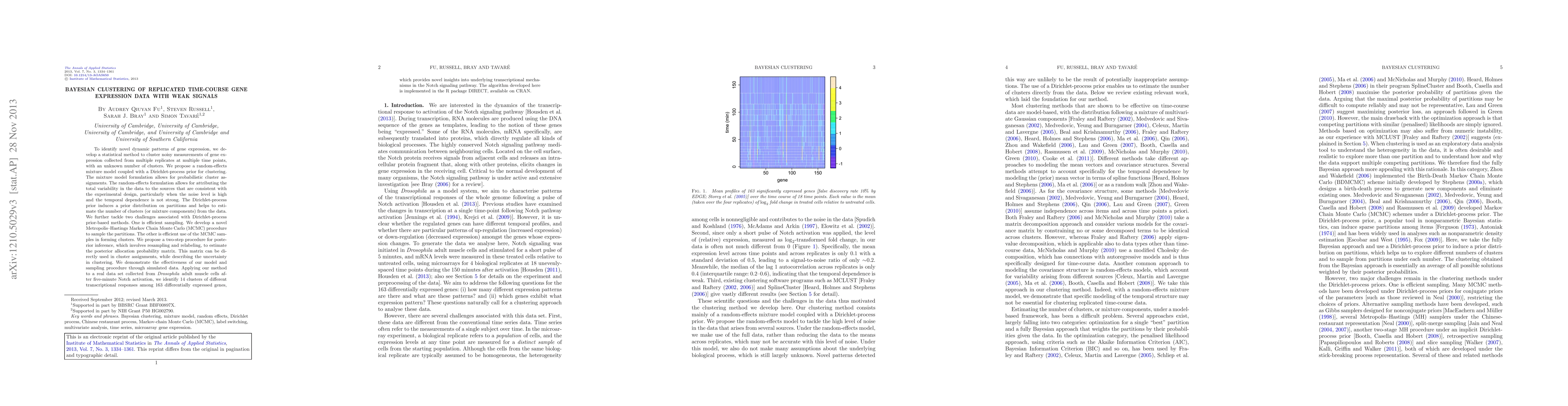 This paper introduces a Bayesian clustering method for time-course gene expression data with weak signals, employing a random-effects mixture model and Dirichlet-process prior to identify dynamic patterns. The proposed method efficiently samples partitions using a novel Metropolis-Hastings MCMC procedure and estimates the number of clusters, providing insights into transcriptional mechanisms in the Notch signaling pathway.