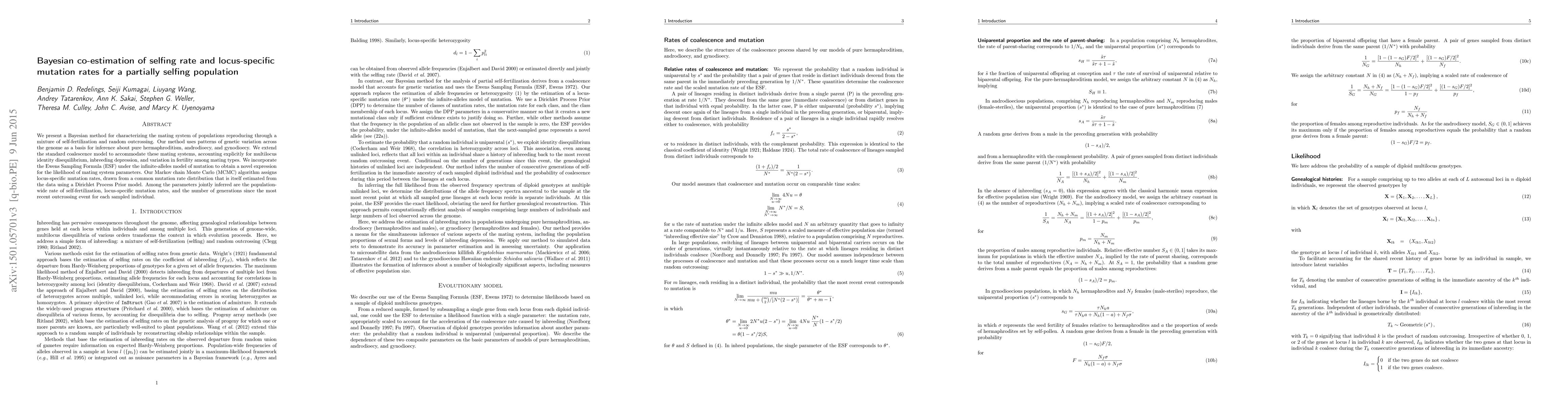 We present a Bayesian method for characterizing the mating system of populations reproducing through a mixture of self-fertilization and random outcrossing. Our method uses patterns of genetic variation across the genome as a basis for inference about pure hermaphroditism, androdioecy, and gynodioecy. We extend the standard coalescence model to accommodate these mating systems, accounting explicitly for multilocus identity disequilibrium, inbreeding depression, and variation in fertility among mating types. We incorporate the Ewens Sampling Formula (ESF) under the infinite-alleles model of mutation to obtain a novel expression for the likelihood of mating system parameters. Our Markov chain Monte Carlo (MCMC) algorithm assigns locus-specific mutation rates, drawn from a common mutation rate distribution that is itself estimated from the data using a Dirichlet Process Prior (DPP) model. Among the parameters jointly inferred are the population-wide rate of self-fertilization, locus-specific mutation rates, and the number of generations since the most recent outcrossing event for each sampled individual.