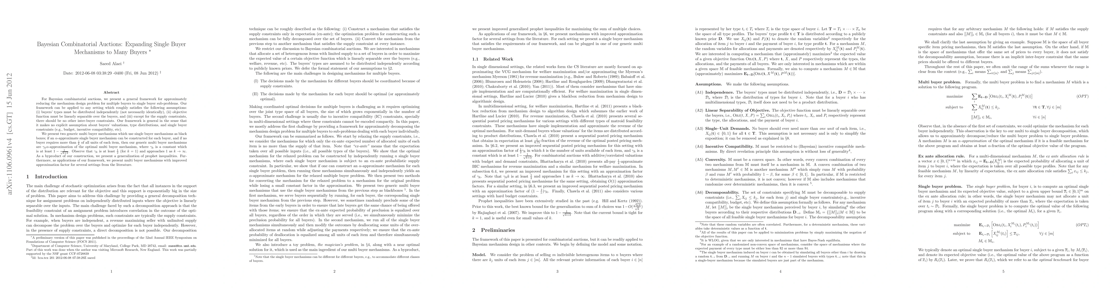 For Bayesian combinatorial auctions, we present a general framework for approximately reducing the mechanism design problem for multiple buyers to single buyer sub-problems. Our framework can be applied to any setting which roughly satisfies the following assumptions: (i) buyers' types must be distributed independently (not necessarily identically), (ii) objective function must be linearly separable over the buyers, and (iii) except for the supply constraints, there should be no other inter-buyer constraints. Our framework is general in the sense that it makes no explicit assumption about buyers' valuations, type distributions, and single buyer constraints (e.g., budget, incentive compatibility, etc). We present two generic multi buyer mechanisms which use single buyer mechanisms as black boxes; if an $\alpha$-approximate single buyer mechanism can be constructed for each buyer, and if no buyer requires more than $\frac{1}{k}$ of all units of each item, then our generic multi buyer mechanisms are $\gamma_k\alpha$-approximation of the optimal multi buyer mechanism, where $\gamma_k$ is a constant which is at least $1-\frac{1}{\sqrt{k+3}}$. Observe that $\gamma_k$ is at least 1/2 (for $k=1$) and approaches 1 as $k \to \infty$. As a byproduct of our construction, we present a generalization of prophet inequalities. Furthermore, as applications of our framework, we present multi buyer mechanisms with improved approximation factor for several settings from the literature.