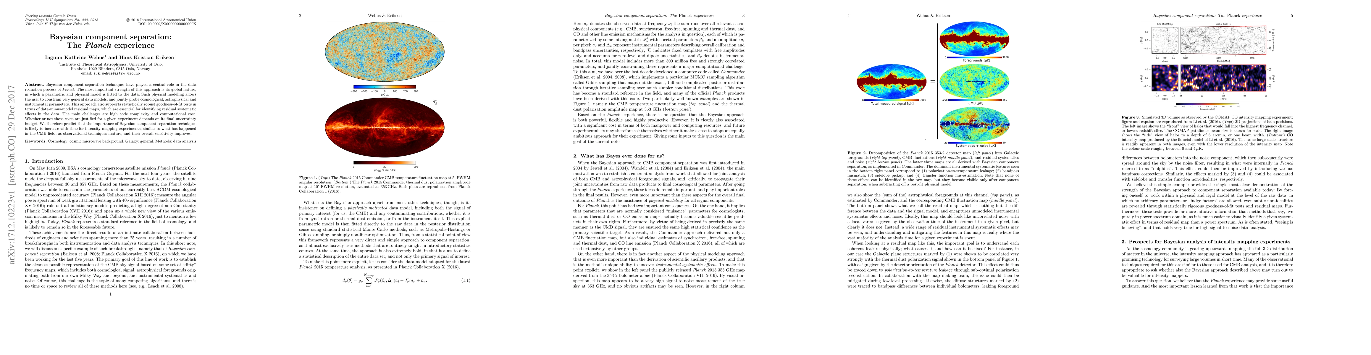 Bayesian component separation techniques have played a central role in the data reduction process of Planck. The most important strength of this approach is its global nature, in which a parametric and physical model is fitted to the data. Such physical modeling allows the user to constrain very general data models, and jointly probe cosmological, astrophysical and instrumental parameters. This approach also supports statistically robust goodness-of-fit tests in terms of data-minus-model residual maps, which are essential for identifying residual systematic effects in the data. The main challenges are high code complexity and computational cost. Whether or not these costs are justified for a given experiment depends on its final uncertainty budget. We therefore predict that the importance of Bayesian component separation techniques is likely to increase with time for intensity mapping experiments, similar to what has happened in the CMB field, as observational techniques mature, and their overall sensitivity improves.