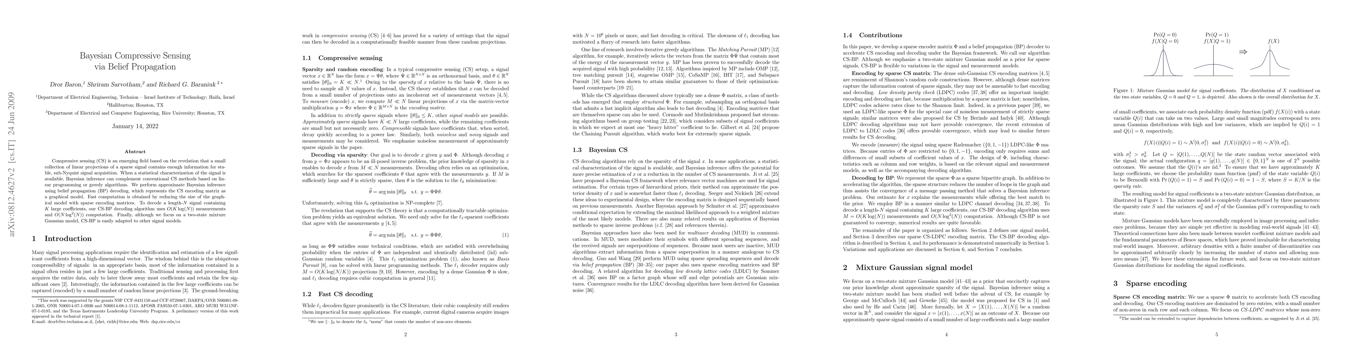 This paper proposes Bayesian compressive sensing using belief propagation (BP) to efficiently decode sparse signals. The CS-BP algorithm leverages sparse encoding matrices to achieve O(Klog(N)) measurements and O(Nlog^2(N)) computation, demonstrating adaptability to various signal models beyond the two-state mixture Gaussian.