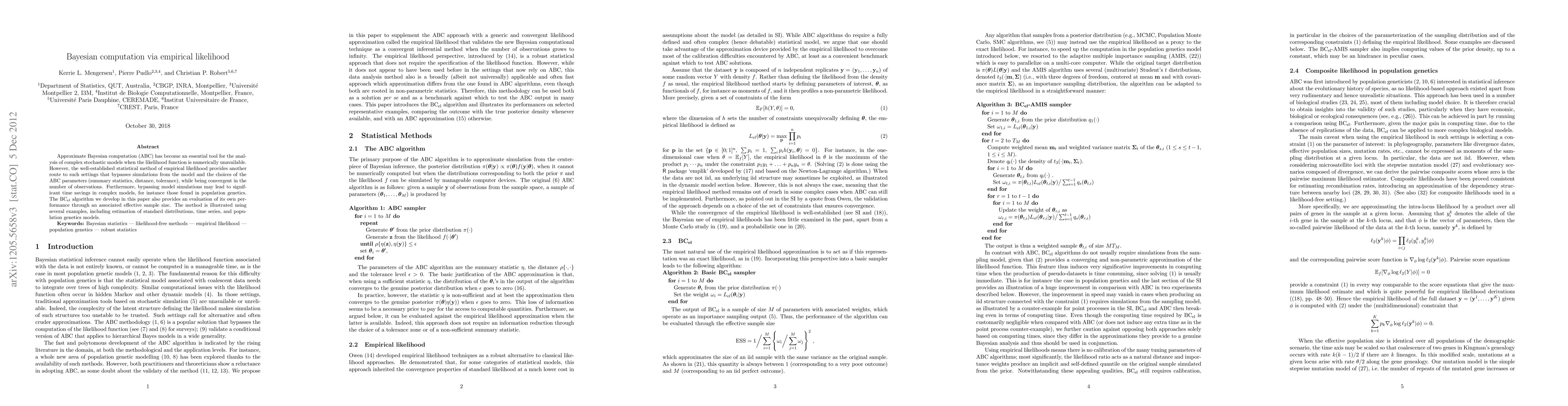 Approximate Bayesian computation (ABC) has become an essential tool for the analysis of complex stochastic models when the likelihood function is numerically unavailable. However, the well-established statistical method of empirical likelihood provides another route to such settings that bypasses simulations from the model and the choices of the ABC parameters (summary statistics, distance, tolerance), while being convergent in the number of observations. Furthermore, bypassing model simulations may lead to significant time savings in complex models, for instance those found in population genetics. The BCel algorithm we develop in this paper also provides an evaluation of its own performance through an associated effective sample size. The method is illustrated using several examples, including estimation of standard distributions, time series, and population genetics models.