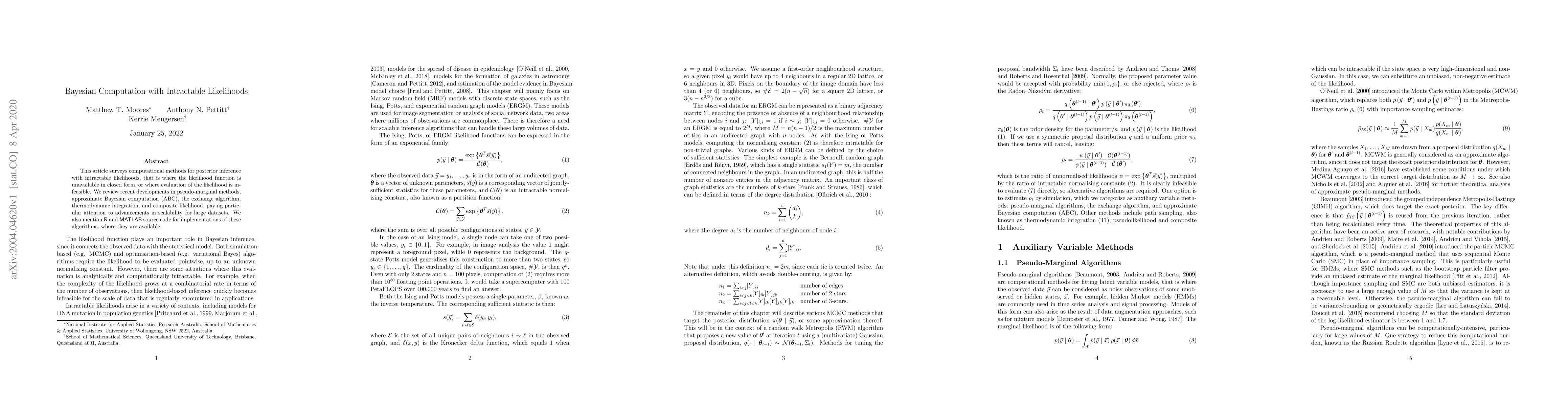 The paper surveys computational methods for posterior inference with intractable likelihoods, focusing on pseudo-marginal methods, approximate Bayesian computation (ABC), the exchange algorithm, thermodynamic integration, and composite likelihood, with an emphasis on scalability for large datasets.