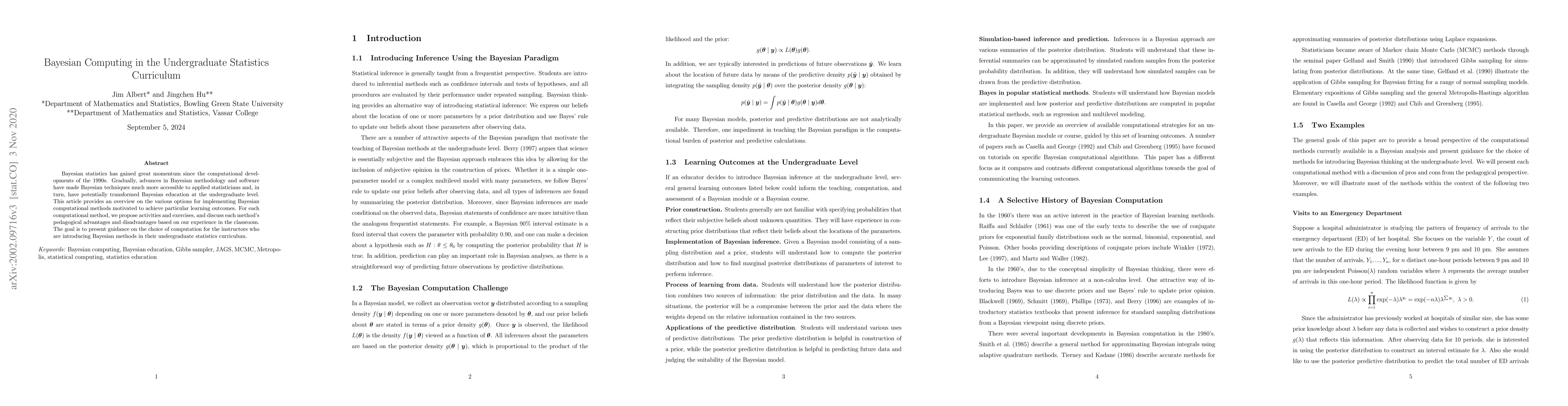 This paper explores various methods for integrating Bayesian computational techniques into undergraduate statistics courses, detailing their advantages and disadvantages based on the authors' classroom experiences. It aims to guide instructors in choosing the best computational approach for teaching Bayesian methods.