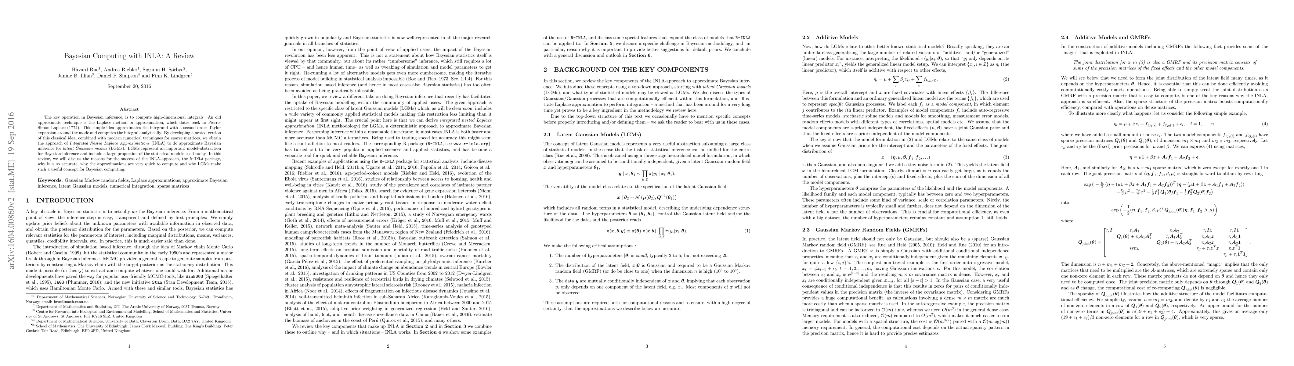 This review explores the Integrated Nested Laplace Approximations (INLA) method, which uses a nested version of the Laplace method combined with modern numerical techniques for sparse matrices to perform approximate Bayesian inference for latent Gaussian models (LGMs). The paper highlights the accuracy, computational speed, and utility of INLA in Bayesian computing.