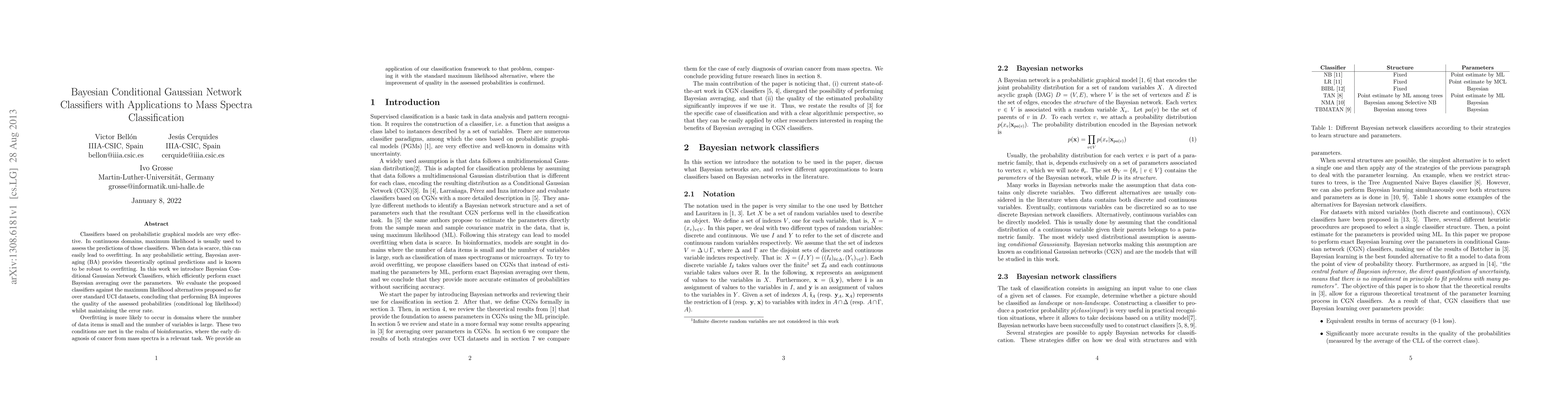 This paper introduces Bayesian Conditional Gaussian Network Classifiers that perform exact Bayesian averaging to mitigate overfitting, especially in data-scarce scenarios. The proposed method is shown to improve the quality of assessed probabilities while maintaining error rates, demonstrated through applications in mass spectra classification for early cancer diagnosis.