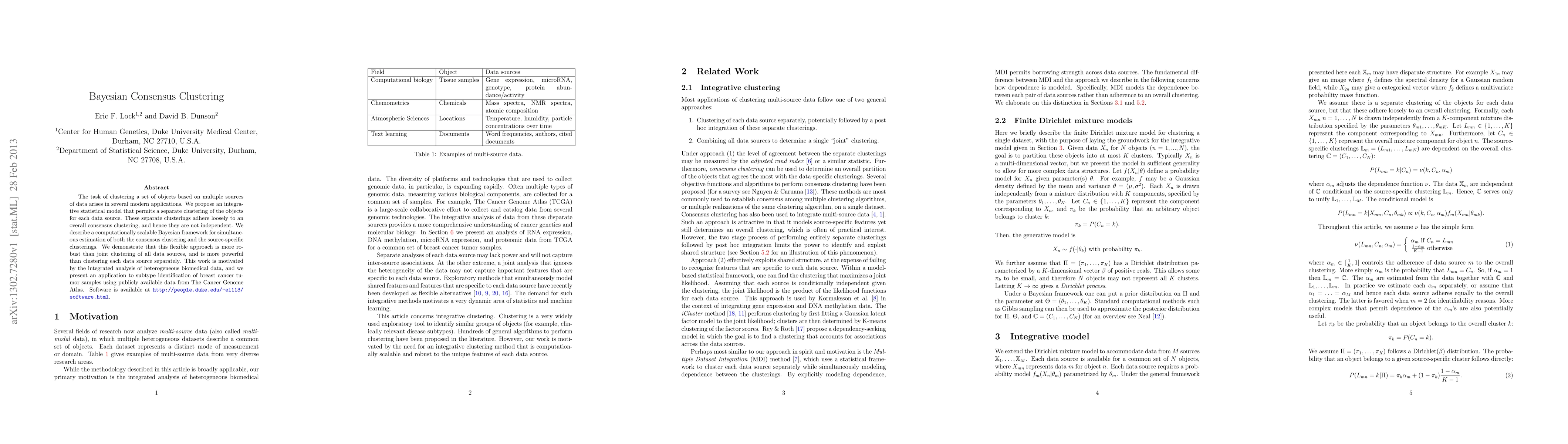 The paper proposes a Bayesian Consensus Clustering (BCC) model that integrates multiple data sources for clustering, modeling both an overall clustering and clusterings specific to each data source. It assumes a simple and general dependence between data sources.