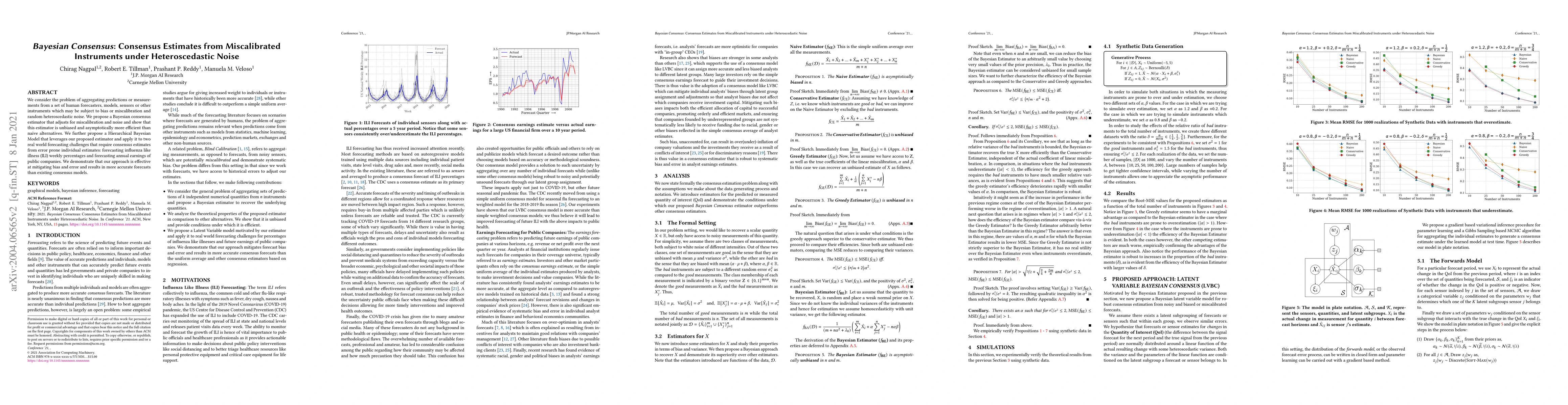 This paper proposes a Bayesian consensus estimator to aggregate predictions from miscalibrated instruments under heteroscedastic noise, demonstrating its unbiasedness and efficiency. The approach is applied to real-world forecasting challenges in influenza and public company earnings, showing improved accuracy over existing methods.