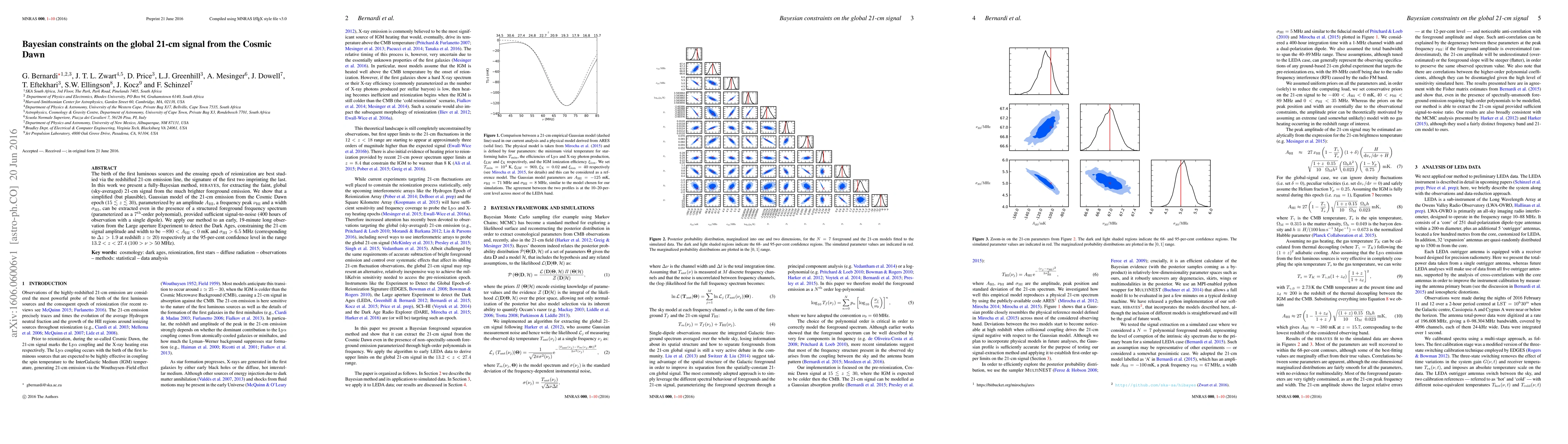 The paper presents a fully-Bayesian method, hibayes, for extracting the global 21-cm signal from foreground emission using a Gaussian model of the 21-cm signal from the Cosmic Dawn epoch, parameterized by amplitude (A_HI), frequency peak (ν_HI), and width (σ_HI).