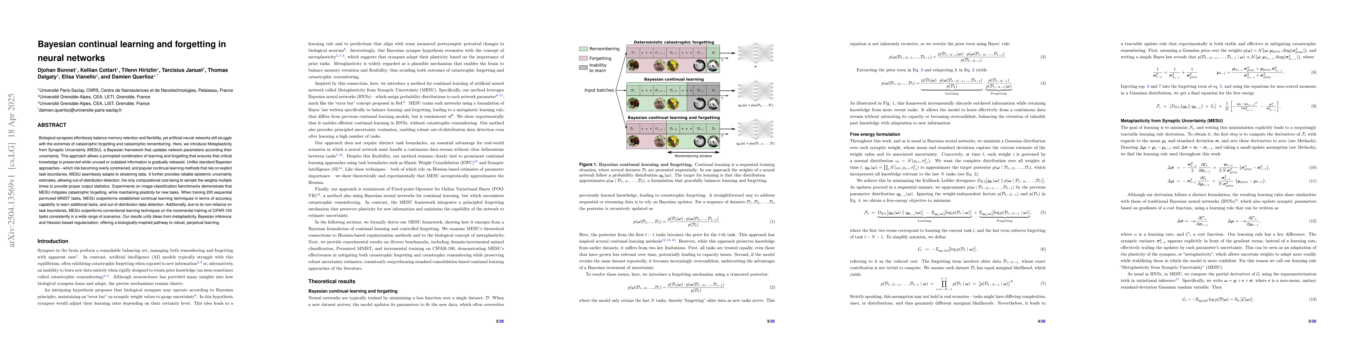 The paper introduces Metaplasticity from Synaptic Uncertainty (MESU), a Bayesian framework for neural networks that updates parameters based on their uncertainty. MESU combines learning and forgetting principles, ensuring critical knowledge retention while gradually releasing outdated information, without explicit task boundaries.