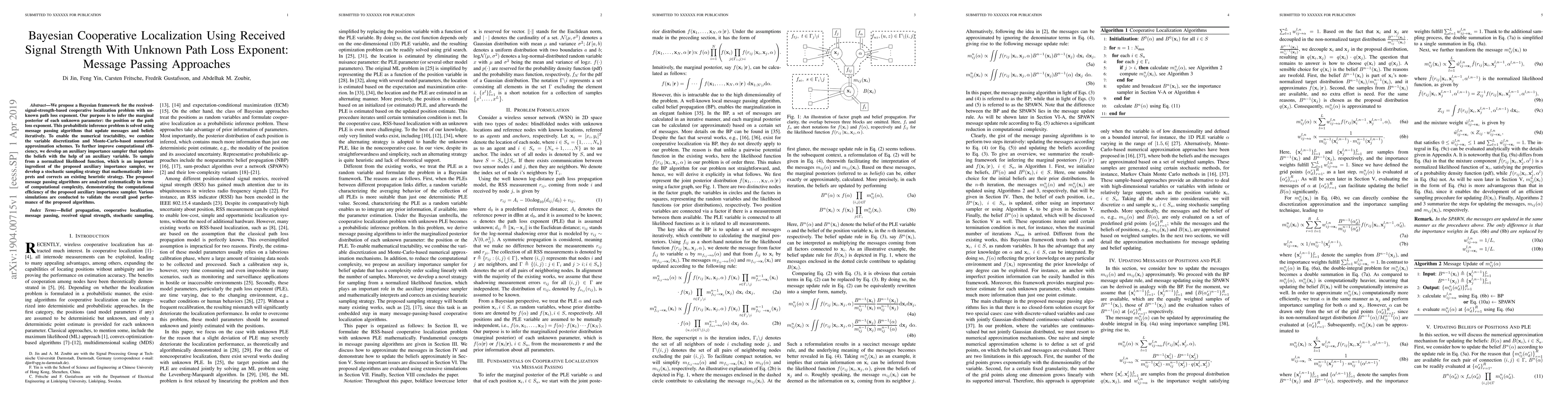 This paper proposes a Bayesian framework for cooperative localization using received signal strength, addressing unknown path loss exponent through message passing algorithms. It introduces an auxiliary importance sampler and a stochastic sampling strategy to enhance computational efficiency and validates the approach through simulations.