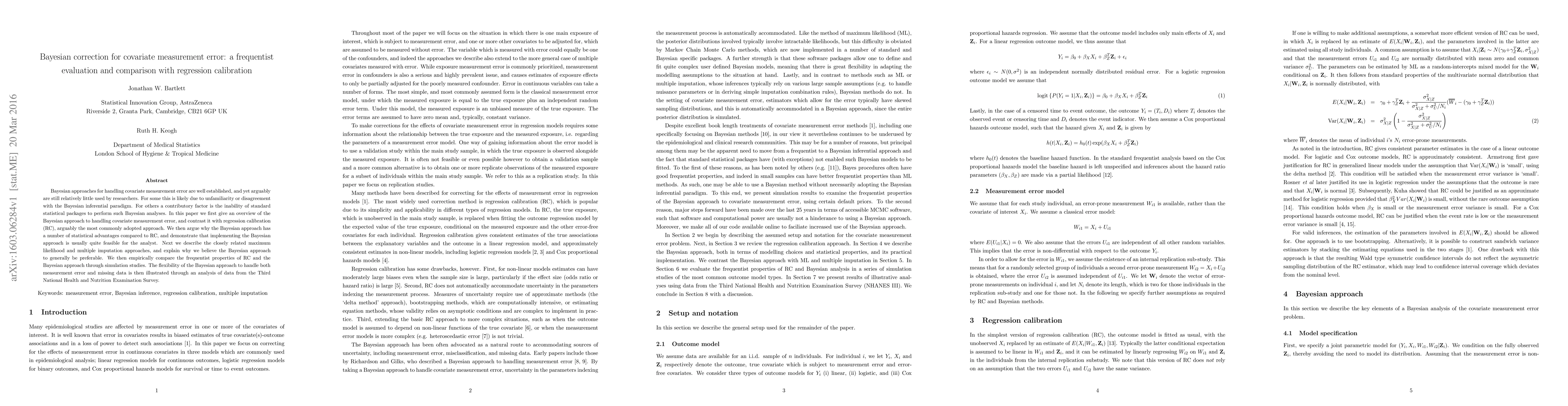 This paper evaluates Bayesian methods for correcting covariate measurement error, comparing them to regression calibration and demonstrating their frequentist properties through simulations. It argues that Bayesian approaches offer statistical advantages and greater flexibility, especially for handling both measurement error and missing data.