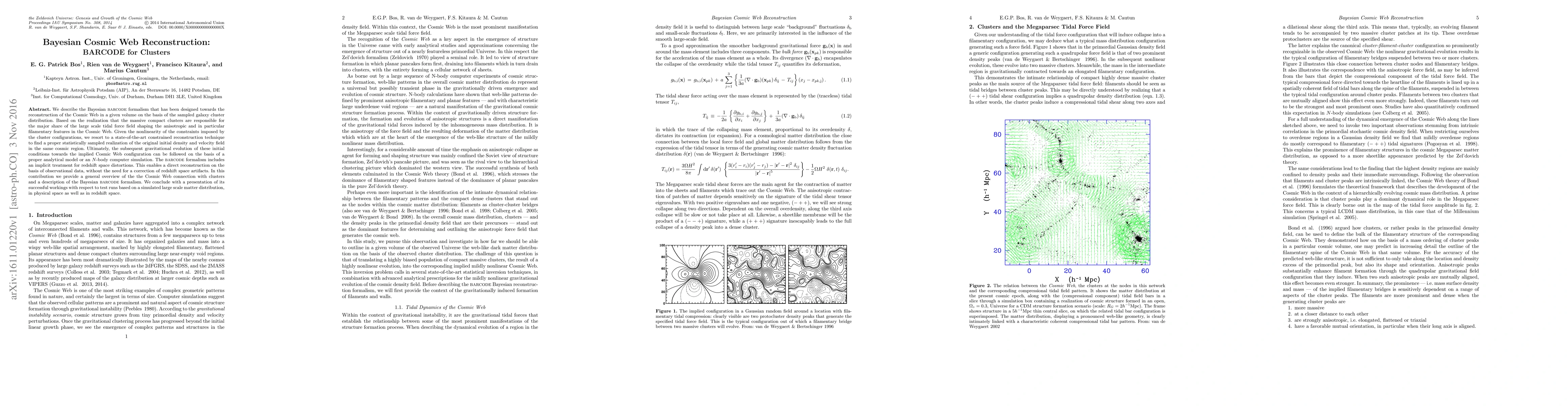 The paper introduces the Bayesian BARCODE formalism for reconstructing the Cosmic Web based on galaxy cluster distributions, emphasizing the role of clusters in shaping the web's filamentary features. The method successfully reconstructs initial density and velocity fields without needing to correct for redshift space distortions, validated through test runs on simulated data.