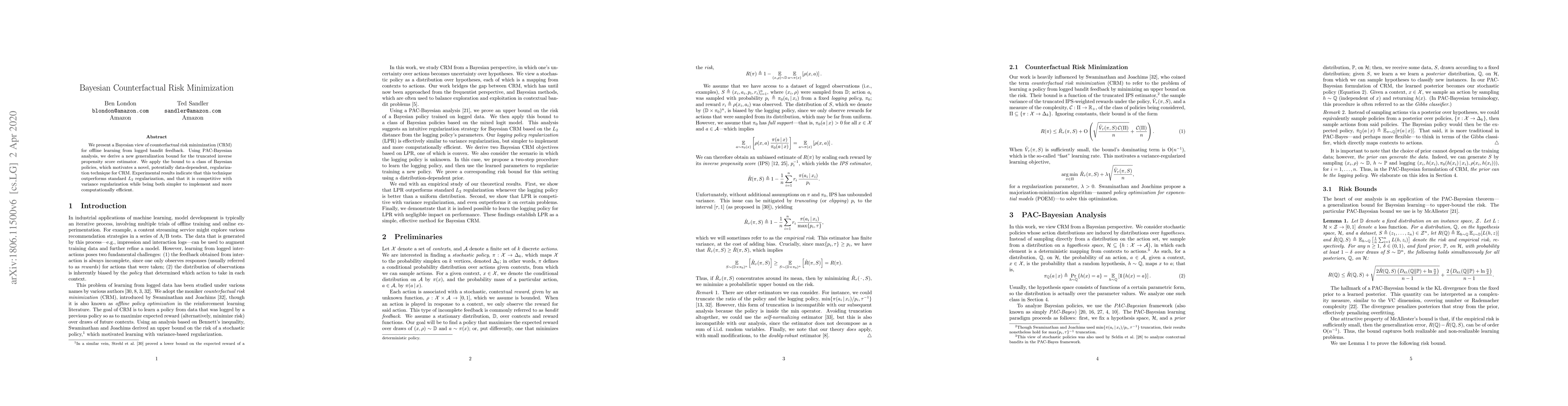 The paper presents a PAC-Bayesian analysis of counterfactual risk minimization (CRM) for learning Bayesian policies from logged bandit feedback. It derives a new generalization bound for the truncated inverse propensity score estimator and proposes a novel regularization technique for CRM based on the logging policy.
