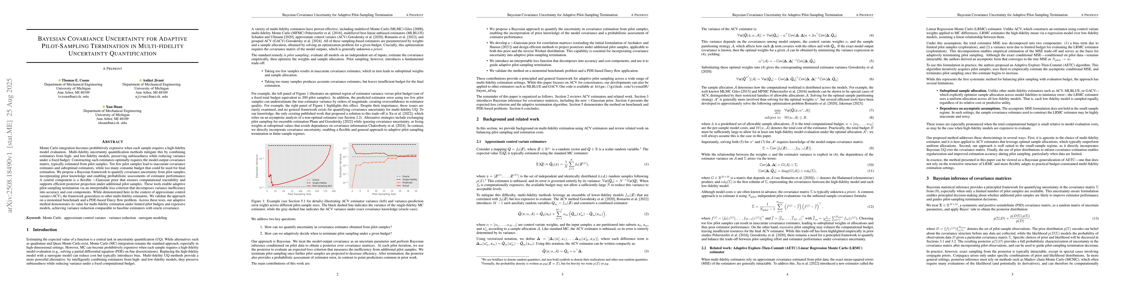 Monte Carlo integration becomes prohibitively expensive when each sample requires a high-fidelity model evaluation. Multi-fidelity uncertainty quantification methods mitigate this by combining estimators from high- and low-fidelity models, preserving unbiasedness while reducing variance under a fixed budget. Constructing such estimators optimally requires the model-output covariance matrix, typically estimated from pilot samples. Too few pilot samples lead to inaccurate covariance estimates and suboptimal estimators, while too many consume budget that could be used for final estimation. We propose a Bayesian framework to quantify covariance uncertainty from pilot samples, incorporating prior knowledge and enabling probabilistic assessments of estimator performance. A central component is a flexible $\gamma$-Gaussian prior that ensures computational tractability and supports efficient posterior projection under additional pilot samples. These tools enable adaptive pilot-sampling termination via an interpretable loss criterion that decomposes variance inefficiency into accuracy and cost components. While demonstrated here in the context of approximate control variates (ACV), the framework generalizes to other multi-fidelity estimators. We validate the approach on a monomial benchmark and a PDE-based Darcy flow problem. Across these tests, our adaptive method demonstrates its value for multi-fidelity estimation under limited pilot budgets and expensive models, achieving variance reduction comparable to baseline estimators with oracle covariance.
