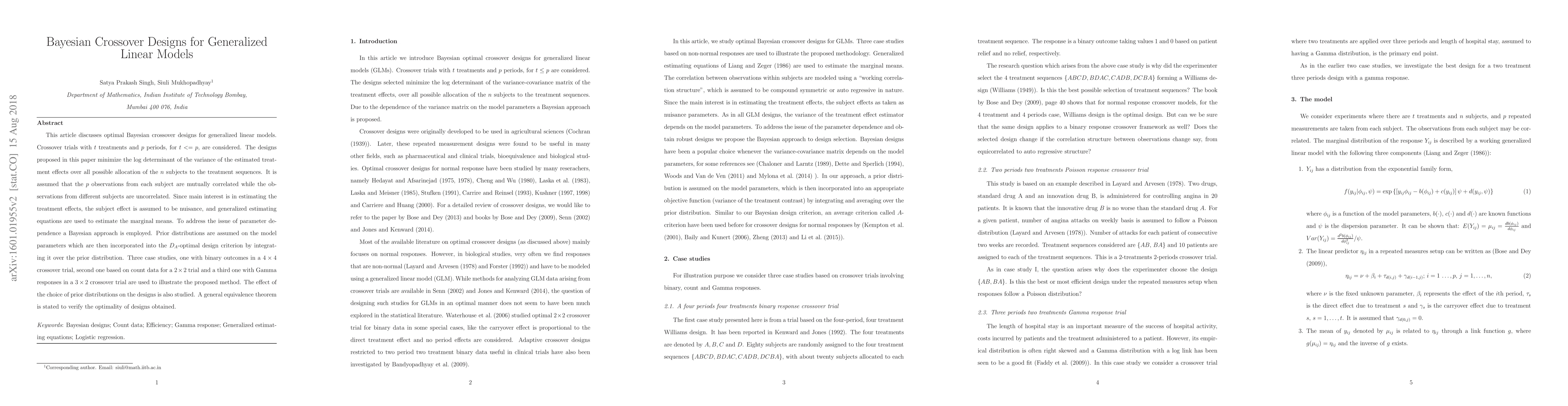This paper proposes D-optimal Bayesian crossover designs for generalized linear models, minimizing the log determinant of the variance of estimated treatment effects. It uses generalized estimating equations to handle correlated observations within subjects and applies Bayesian methods to address parameter dependence, illustrated through case studies with binary, count, and Gamma outcomes.
