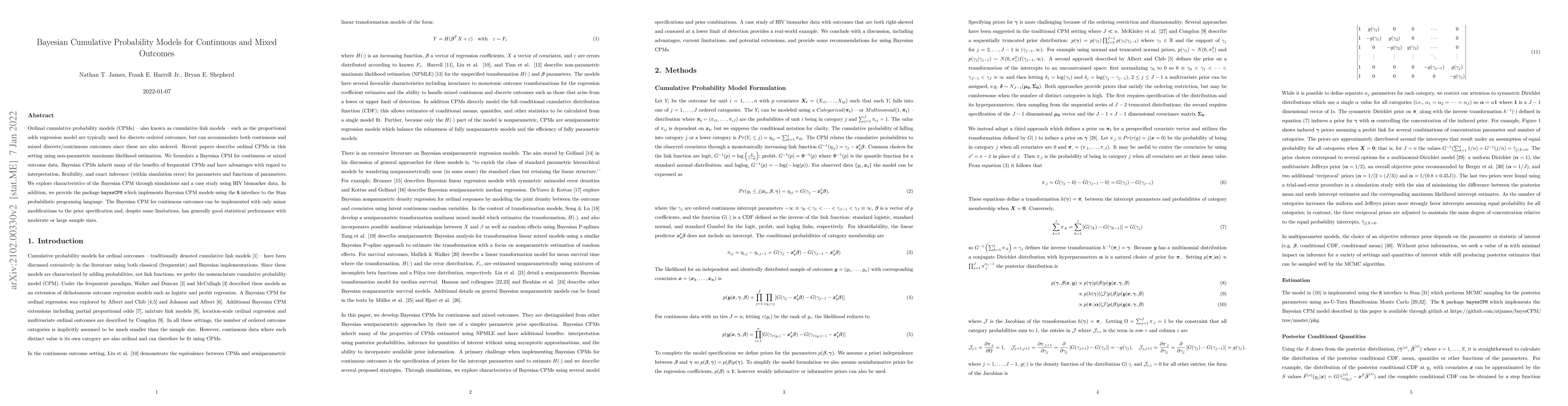 This paper proposes a Bayesian cumulative probability model (CPM) for continuous and mixed outcomes, offering advantages in interpretation, flexibility, and exact inference over frequentist methods. The authors demonstrate the model's performance through simulations and a case study on HIV biomarker data, and provide the 'bayesCPM' package for implementation in R.