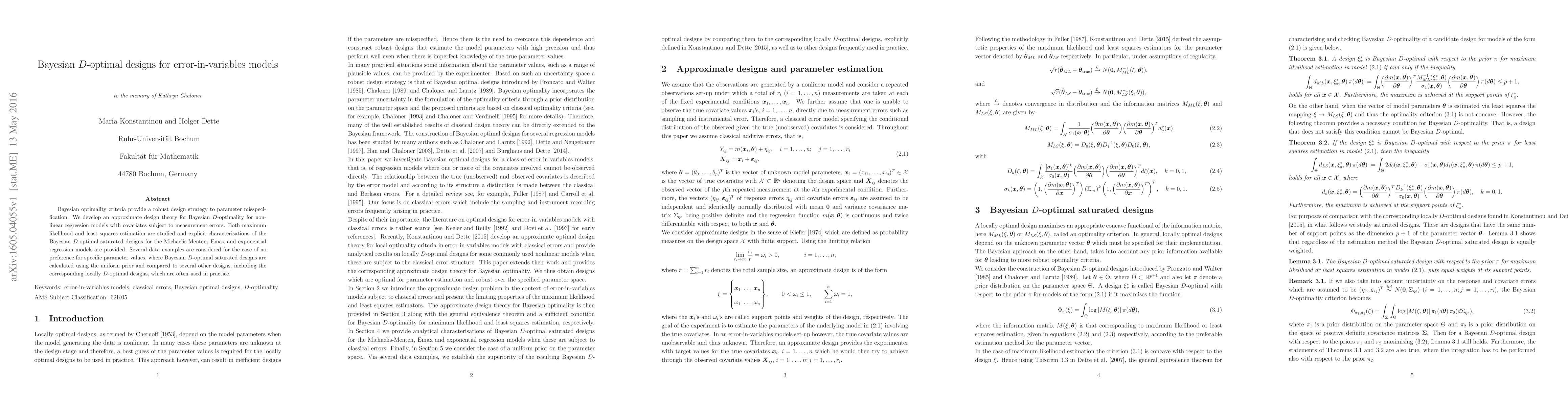 This paper develops an approximate Bayesian $D$-optimal design theory for non-linear regression models with measurement errors, providing explicit characterizations for Michaelis-Menten, Emax, and exponential models. The study compares Bayesian $D$-optimal designs with locally $D$-optimal designs using uniform priors and various data examples.
