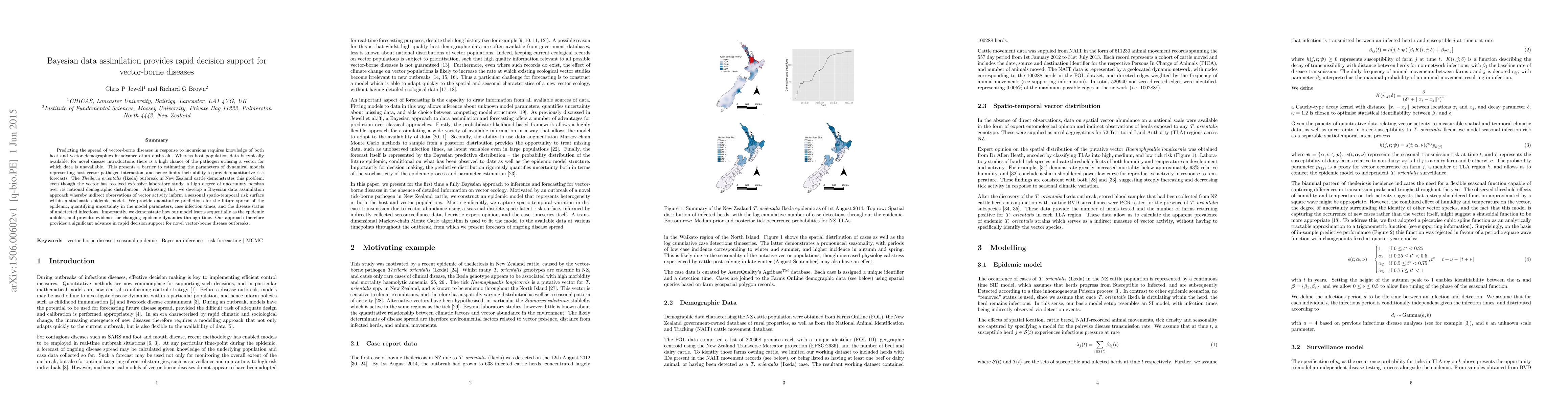 Predicting the spread of vector-borne diseases in response to incursions requires knowledge of both host and vector demographics in advance of an outbreak. Whereas host population data is typically available, for novel disease introductions there is a high chance of the pathogen utilising a vector for which data is unavailable. This presents a barrier to estimating the parameters of dynamical models representing host-vector-pathogen interaction, and hence limits their ability to provide quantitative risk forecasts. The Theileria orientalis (Ikeda) outbreak in New Zealand cattle demonstrates this problem: even though the vector has received extensive laboratory study, a high degree of uncertainty persists over its national demographic distribution. Addressing this, we develop a Bayesian data assimilation approach whereby indirect observations of vector activity inform a seasonal spatio-temporal risk surface within a stochastic epidemic model. We provide quantitative predictions for the future spread of the epidemic, quantifying uncertainty in the model parameters, case infection times, and the disease status of undetected infections. Importantly, we demonstrate how our model learns sequentially as the epidemic unfolds, and provides evidence for changing epidemic dynamics through time. Our approach therefore provides a significant advance in rapid decision support for novel vector-borne disease outbreaks.