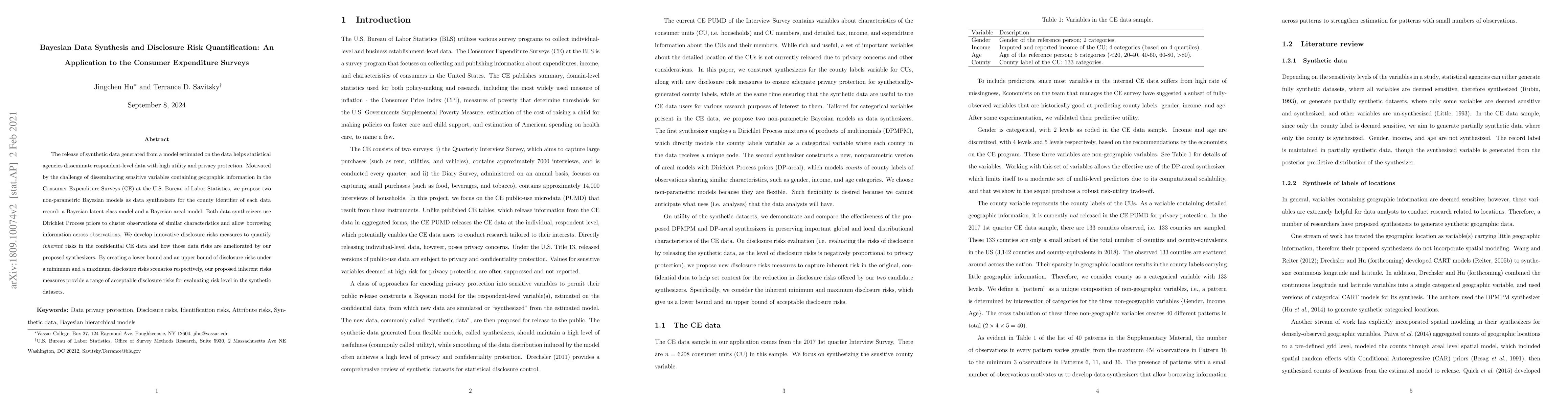 This paper proposes two non-parametric Bayesian models to synthesize data from the Consumer Expenditure Surveys while protecting geographic information privacy. It introduces innovative disclosure risk measures to quantify and mitigate risks in the confidential data, providing a range of acceptable risks for evaluating synthetic datasets.