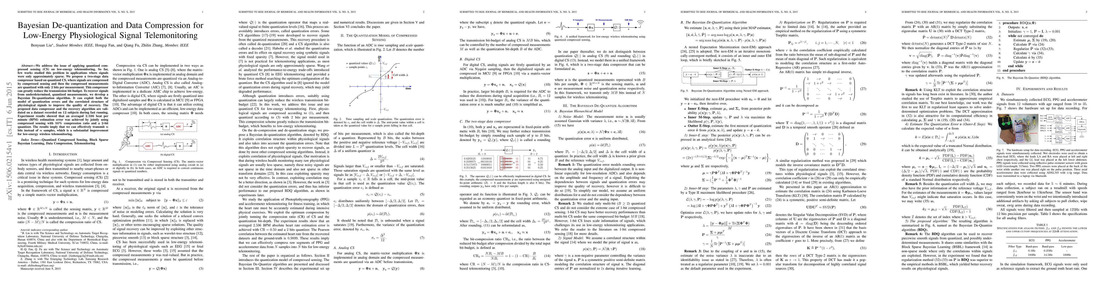 This paper proposes a two-stage data compressor for low-energy physiological signal telemonitoring using quantized compressed sensing and a Bayesian De-quantization algorithm to recover signals, achieving an average 2.596 BPM estimation error with 50% compression ratio and 2-bit quantization, significantly reducing transmission bit-budget.
