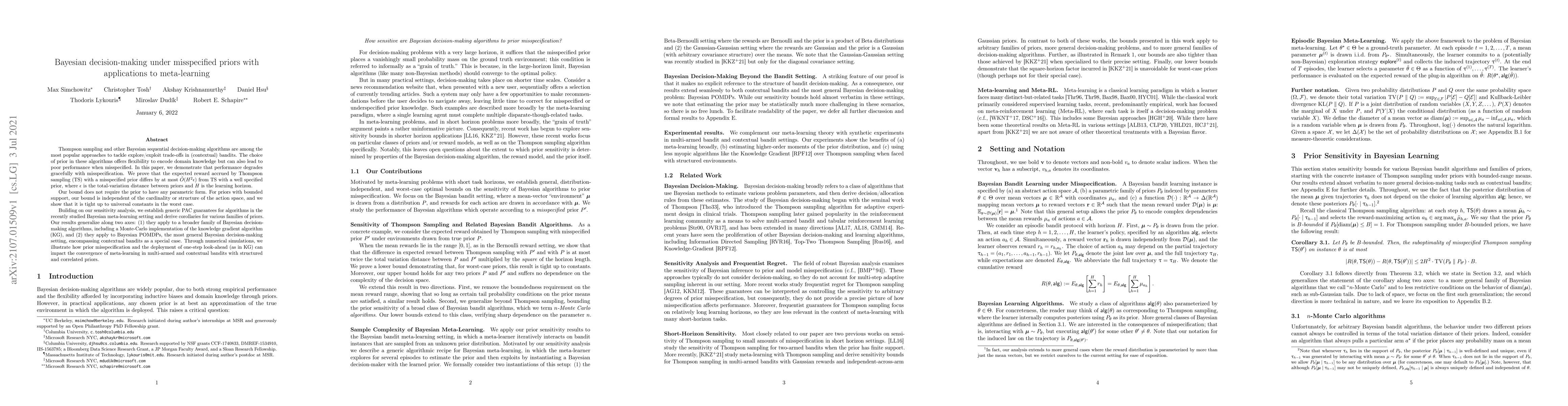 Thompson sampling and other Bayesian sequential decision-making algorithms are among the most popular approaches to tackle explore/exploit trade-offs in (contextual) bandits. The choice of prior in these algorithms offers flexibility to encode domain knowledge but can also lead to poor performance when misspecified. In this paper, we demonstrate that performance degrades gracefully with misspecification. We prove that the expected reward accrued by Thompson sampling (TS) with a misspecified prior differs by at most $\tilde{\mathcal{O}}(H^2 \epsilon)$ from TS with a well specified prior, where $\epsilon$ is the total-variation distance between priors and $H$ is the learning horizon. Our bound does not require the prior to have any parametric form. For priors with bounded support, our bound is independent of the cardinality or structure of the action space, and we show that it is tight up to universal constants in the worst case. Building on our sensitivity analysis, we establish generic PAC guarantees for algorithms in the recently studied Bayesian meta-learning setting and derive corollaries for various families of priors. Our results generalize along two axes: (1) they apply to a broader family of Bayesian decision-making algorithms, including a Monte-Carlo implementation of the knowledge gradient algorithm (KG), and (2) they apply to Bayesian POMDPs, the most general Bayesian decision-making setting, encompassing contextual bandits as a special case. Through numerical simulations, we illustrate how prior misspecification and the deployment of one-step look-ahead (as in KG) can impact the convergence of meta-learning in multi-armed and contextual bandits with structured and correlated priors.