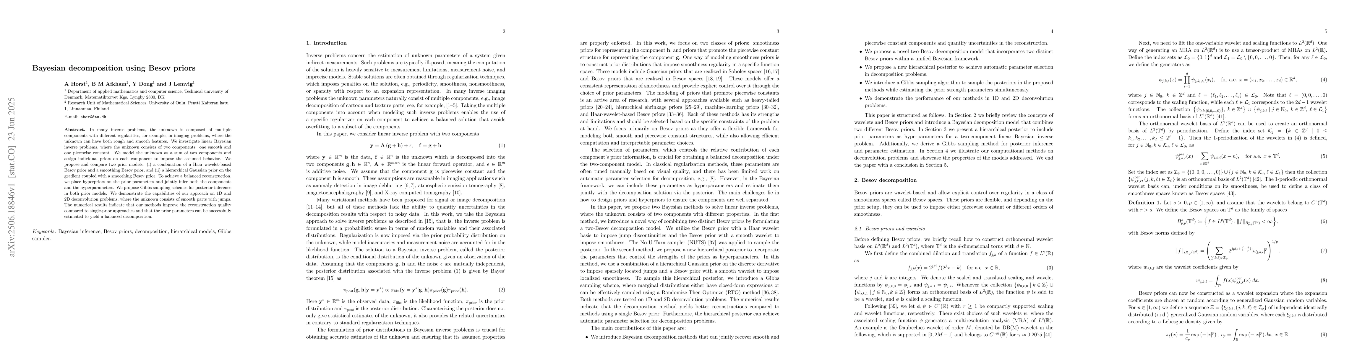 In many inverse problems, the unknown is composed of multiple components with different regularities, for example, in imaging problems, where the unknown can have both rough and smooth features. We investigate linear Bayesian inverse problems, where the unknown consists of two components: one smooth and one piecewise constant. We model the unknown as a sum of two components and assign individual priors on each component to impose the assumed behavior. We propose and compare two prior models: (i) a combination of a Haar wavelet-based Besov prior and a smoothing Besov prior, and (ii) a hierarchical Gaussian prior on the gradient coupled with a smoothing Besov prior. To achieve a balanced reconstruction, we place hyperpriors on the prior parameters and jointly infer both the components and the hyperparameters. We propose Gibbs sampling schemes for posterior inference in both prior models. We demonstrate the capabilities of our approach on 1D and 2D deconvolution problems, where the unknown consists of smooth parts with jumps. The numerical results indicate that our methods improve the reconstruction quality compared to single-prior approaches and that the prior parameters can be successfully estimated to yield a balanced decomposition.