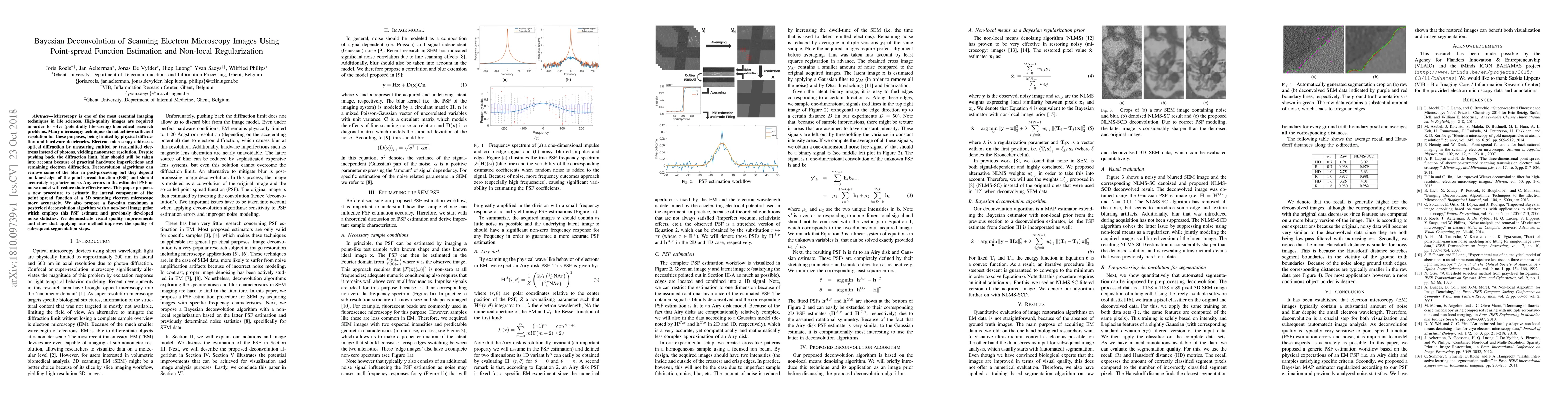 This paper introduces a Bayesian deconvolution method for enhancing scanning electron microscopy images by accurately estimating the point-spread function and employing non-local regularization. The proposed technique improves image resolution and quality, leading to better segmentation outcomes in biomedical research.