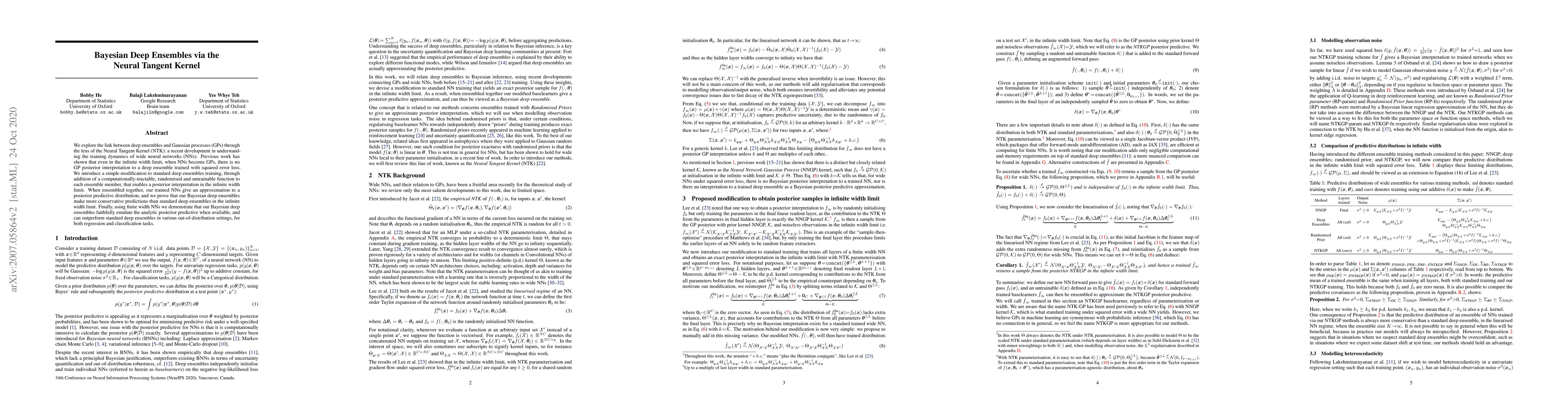 The paper explores the link between deep ensembles and Gaussian processes (GPs) using the Neural Tangent Kernel (NTK). It introduces a modification to standard deep ensembles training, enabling a posterior interpretation in the infinite width limit. The proposed Bayesian deep ensembles are shown to make more conservative predictions than standard deep ensembles in this limit.