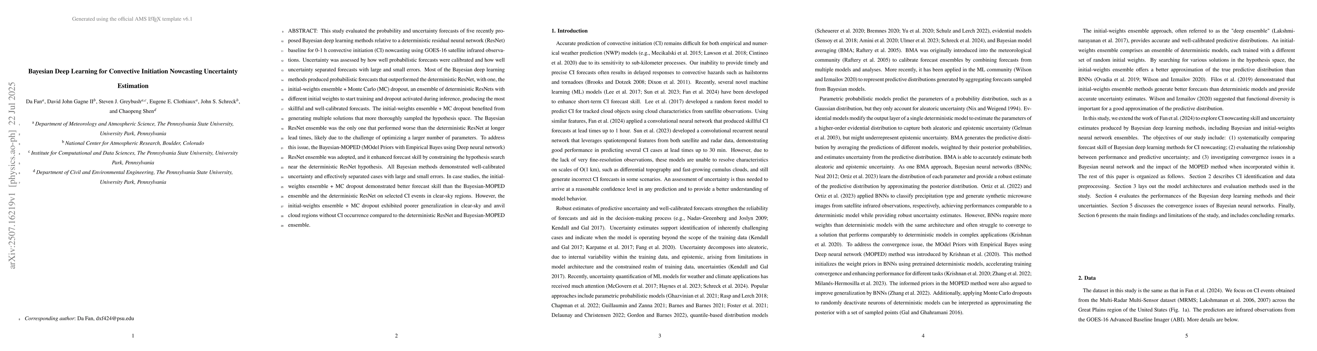 The paper presents and compares various Bayesian deep learning methods for nowcasting convective initiation, demonstrating their superiority over a deterministic baseline in terms of forecast skill and uncertainty estimation.