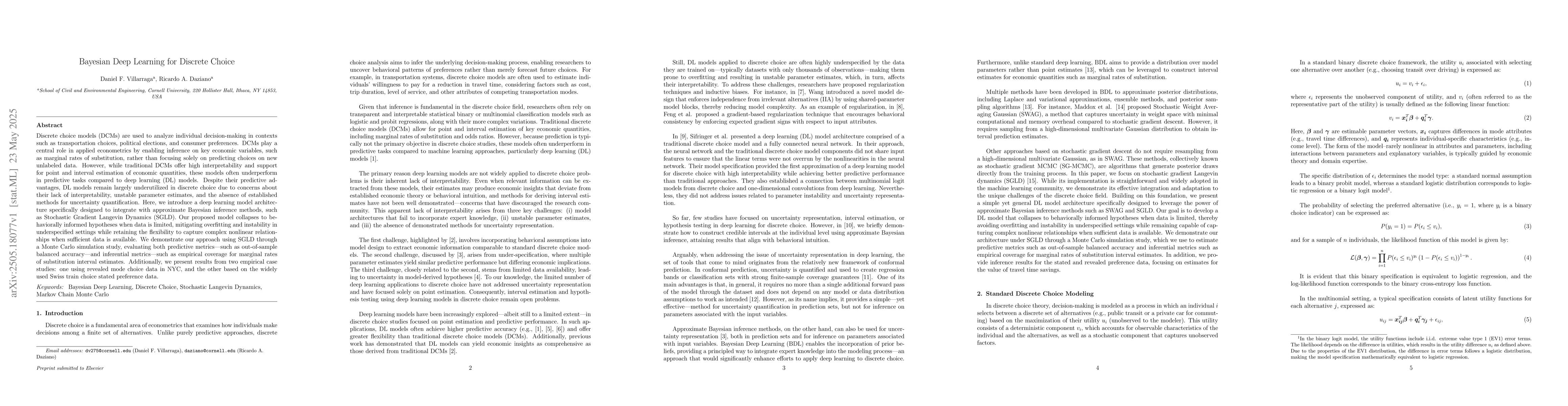 This work is novel by proposing a deep learning model architecture that specifically addresses the interpretability concerns of DL models in discrete choice contexts while leveraging Bayesian inference for uncertainty quantification, a combination not extensively explored in previous research.