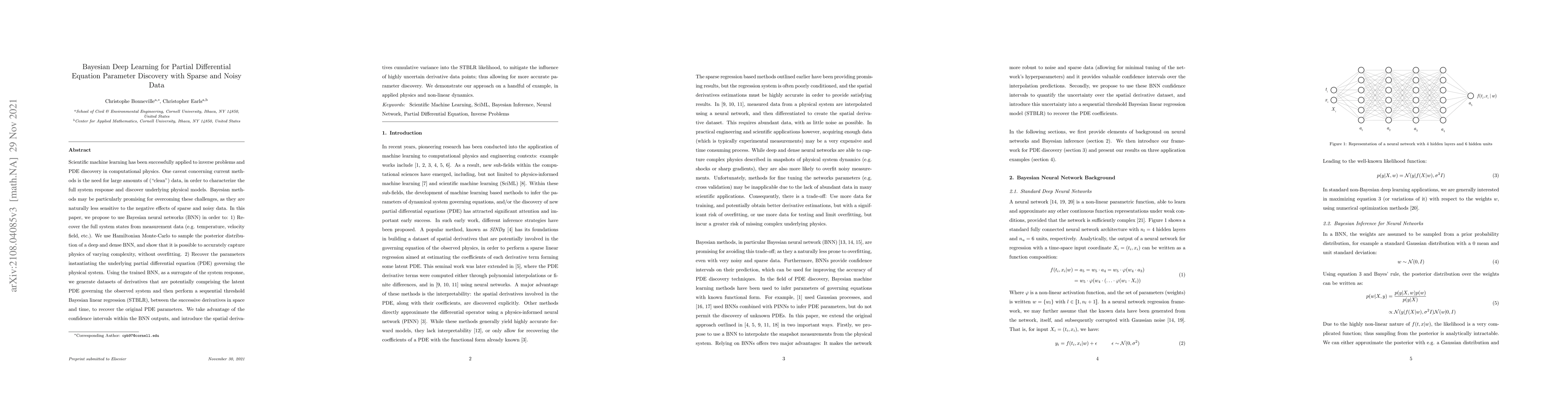 This paper proposes using Bayesian neural networks (BNN) to recover full system states from sparse and noisy data and to discover parameters of underlying partial differential equations (PDEs). It employs Hamiltonian Monte-Carlo for posterior sampling and sequential threshold Bayesian linear regression to mitigate uncertainties, demonstrating accurate PDE parameter recovery in applied physics and non-linear dynamics.