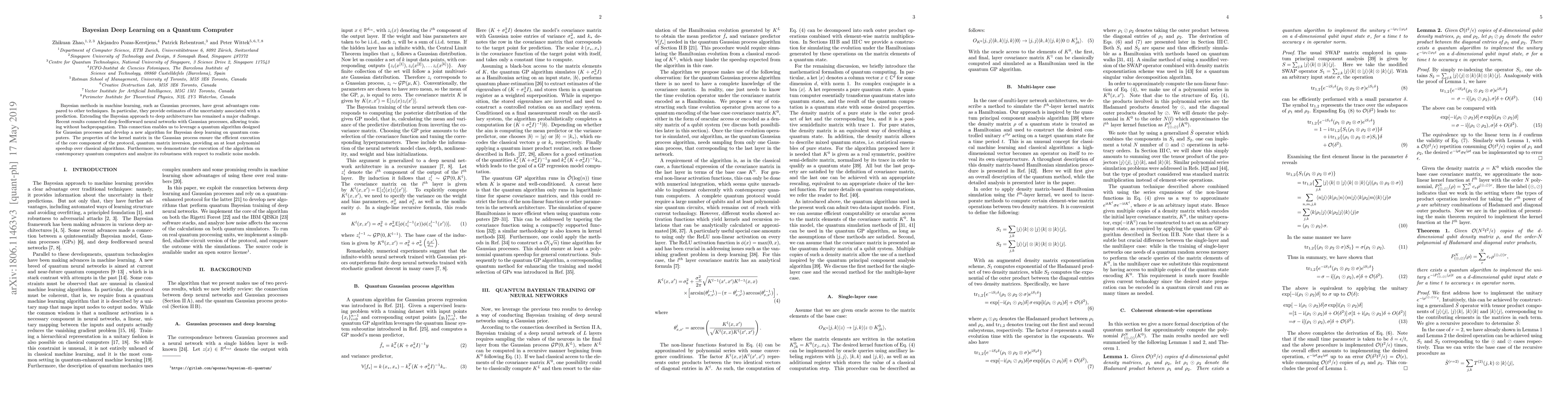 This paper proposes a novel algorithm for Bayesian deep learning on quantum computers, leveraging the connection between deep feedforward neural networks and Gaussian processes. It achieves a polynomial speedup over classical algorithms through quantum matrix inversion and demonstrates its execution and robustness on contemporary quantum hardware.