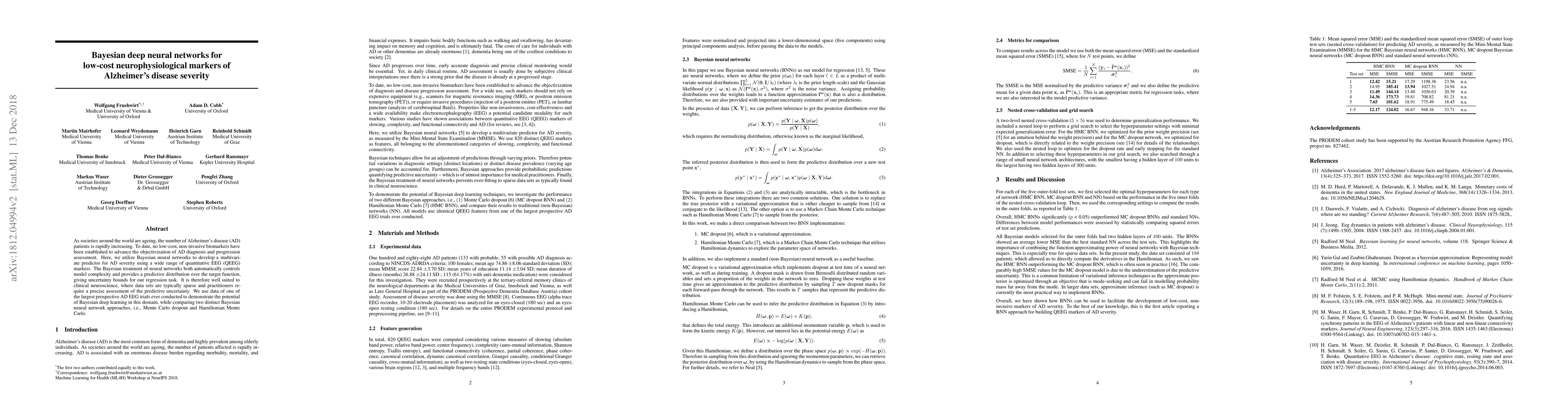 This paper develops a Bayesian deep neural network to predict Alzheimer's disease severity using quantitative EEG markers, aiming to provide low-cost, non-invasive diagnostic tools. It compares two Bayesian approaches, Monte Carlo dropout and Hamiltonian Monte Carlo, to evaluate their effectiveness in handling sparse clinical data and providing uncertainty bounds.