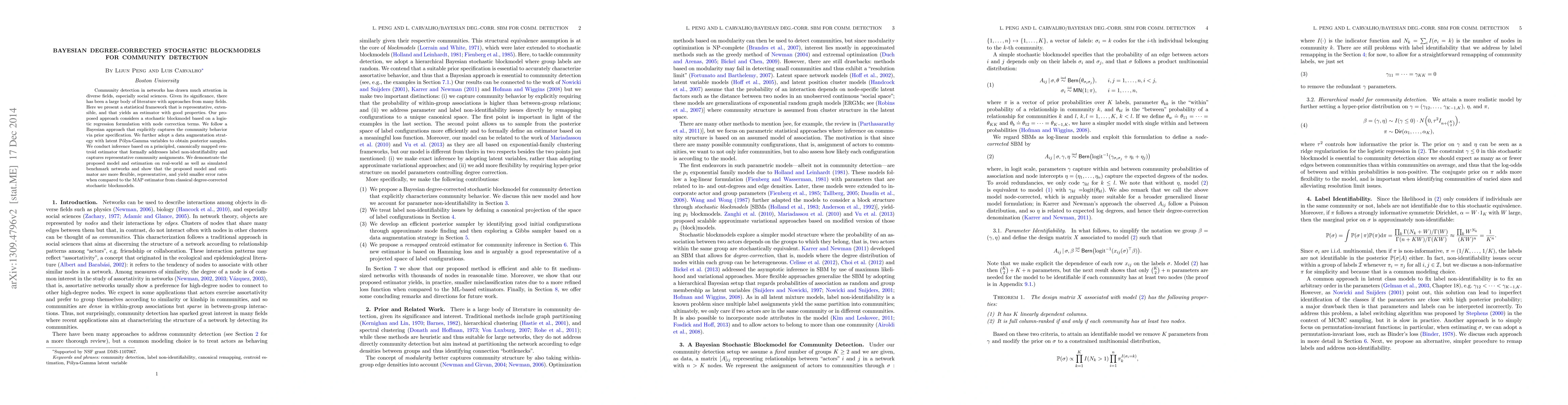 This paper proposes a Bayesian degree-corrected stochastic blockmodel for community detection, utilizing a logistic regression formulation with node correction terms. The model employs a data augmentation strategy and a canonical centroid estimator to achieve more flexible and representative community assignments, outperforming traditional methods in error rates.