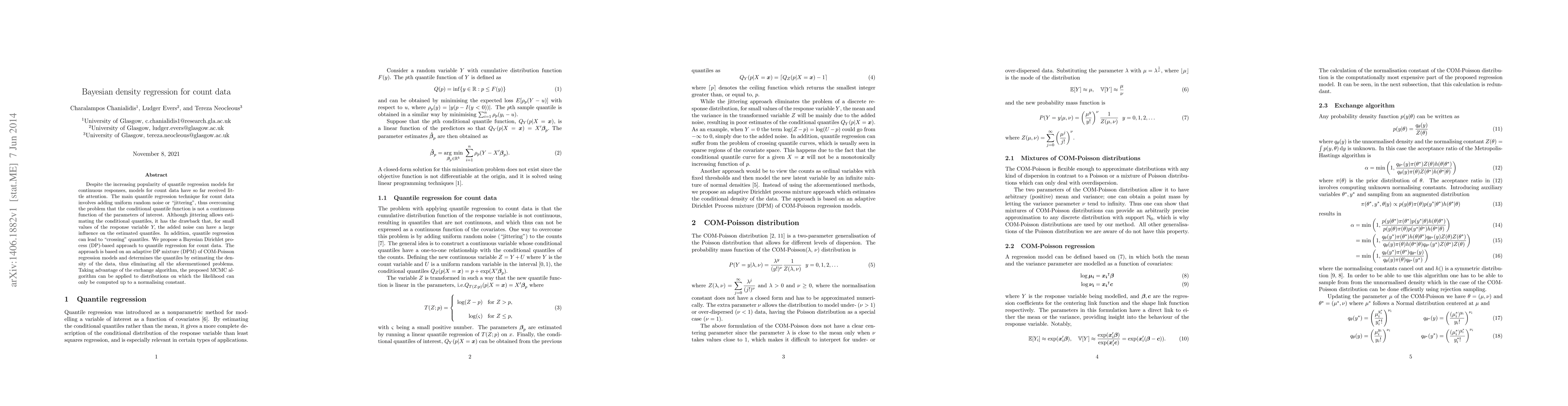 This paper proposes a Bayesian Dirichlet process-based approach for quantile regression of count data, addressing issues with existing methods like jittering. It uses an adaptive Dirichlet process mixture of COM-Poisson regression models to estimate data density and avoid problems like "crossing" quantiles.