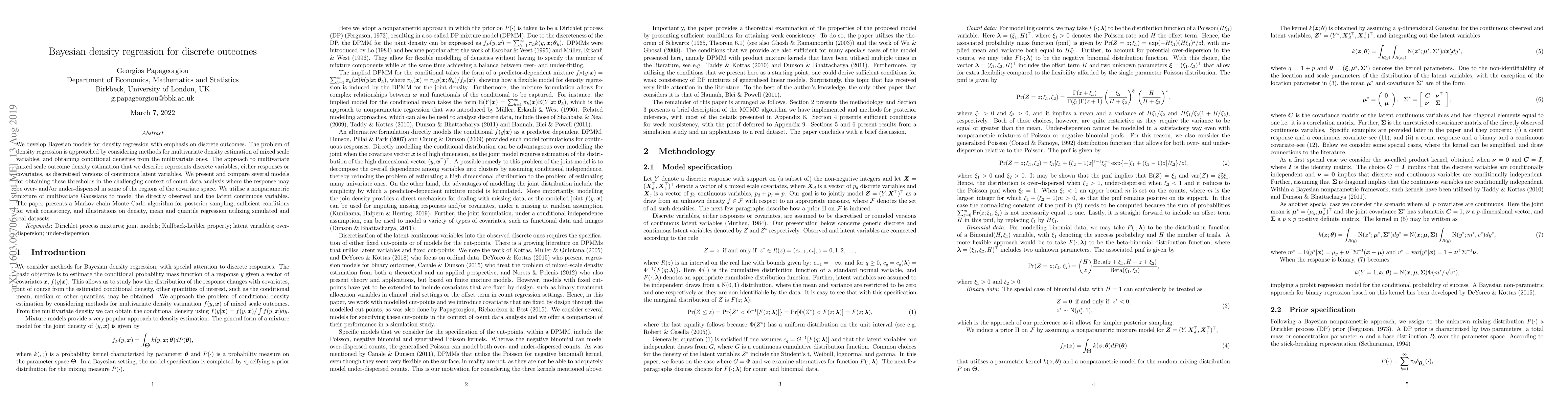 The paper develops Bayesian models for density regression with a focus on discrete outcomes, representing discrete variables as discretised versions of continuous latent variables. It utilizes a nonparametric mixture of multivariate Gaussians to model observed and latent continuous variables, and presents a Markov chain Monte Carlo algorithm for posterior sampling.