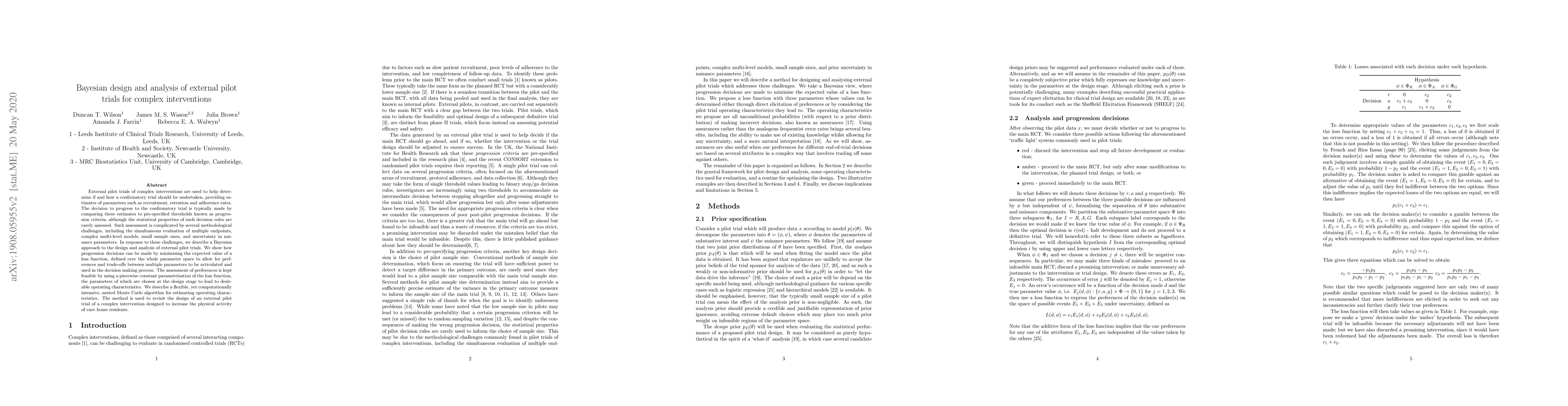 A new Bayesian approach is proposed for designing and analyzing external pilot trials of complex interventions, enabling more informed decision-making about trial progression. The method uses a loss function to balance competing parameters and provides a flexible framework for assessing preferences and operating characteristics.