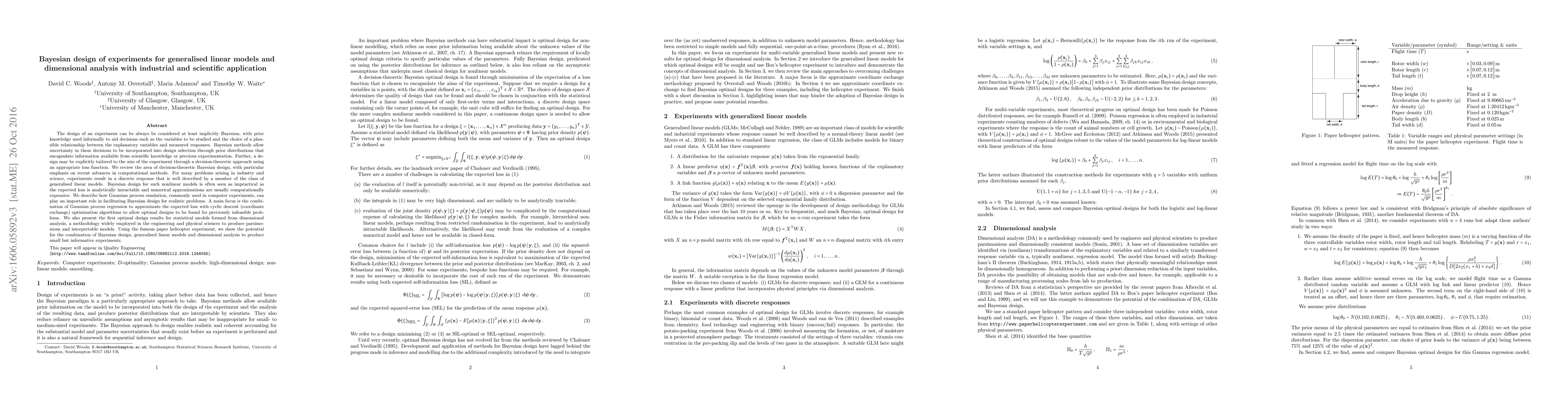 This paper reviews Bayesian design of experiments for generalised linear models, focusing on computational advances and Gaussian process emulation. It combines Gaussian process regression with cyclic descent optimisation to find optimal designs for complex problems, and presents the first optimal designs for models derived from dimensional analysis, demonstrating its application through a helicopter experiment.