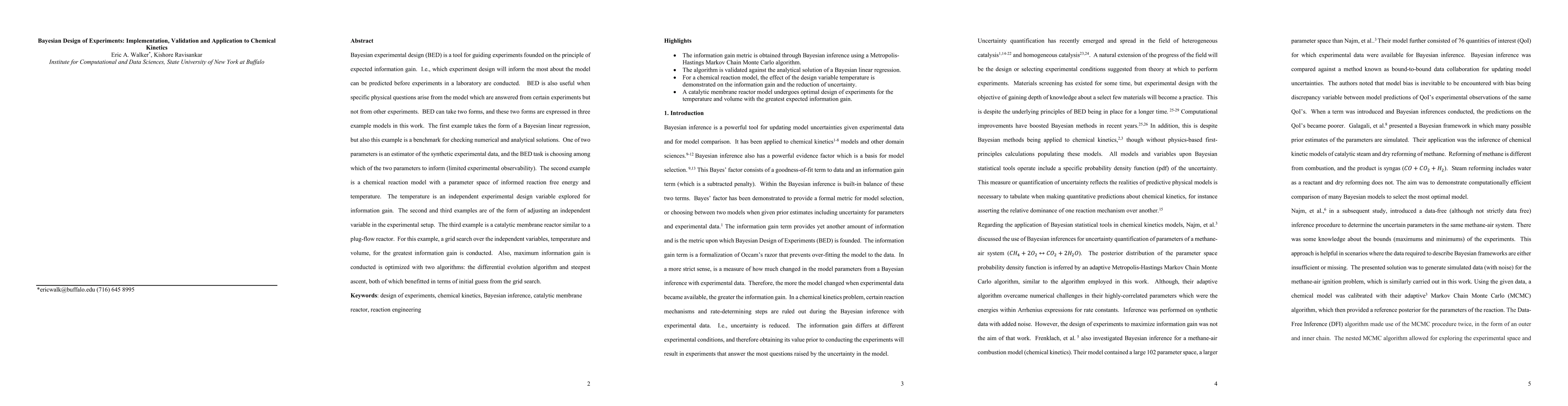 Bayesian experimental design (BED) is a tool for guiding experiments founded on the principle of expected information gain. I.e., which experiment design will inform the most about the model can be predicted before experiments in a laboratory are conducted. BED is also useful when specific physical questions arise from the model which are answered from certain experiments but not from other experiments. BED can take two forms, and these two forms are expressed in three example models in this work. The first example takes the form of a Bayesian linear regression, but also this example is a benchmark for checking numerical and analytical solutions. One of two parameters is an estimator of the synthetic experimental data, and the BED task is choosing among which of the two parameters to inform (limited experimental observability). The second example is a chemical reaction model with a parameter space of informed reaction free energy and temperature. The temperature is an independent experimental design variable explored for information gain. The second and third examples are of the form of adjusting an independent variable in the experimental setup. The third example is a catalytic membrane reactor similar to a plug-flow reactor. For this example, a grid search over the independent variables, temperature and volume, for the greatest information gain is conducted. Also, maximum information gain is conducted is optimized with two algorithms: the differential evolution algorithm and steepest ascent, both of which benefitted in terms of initial guess from the grid search.