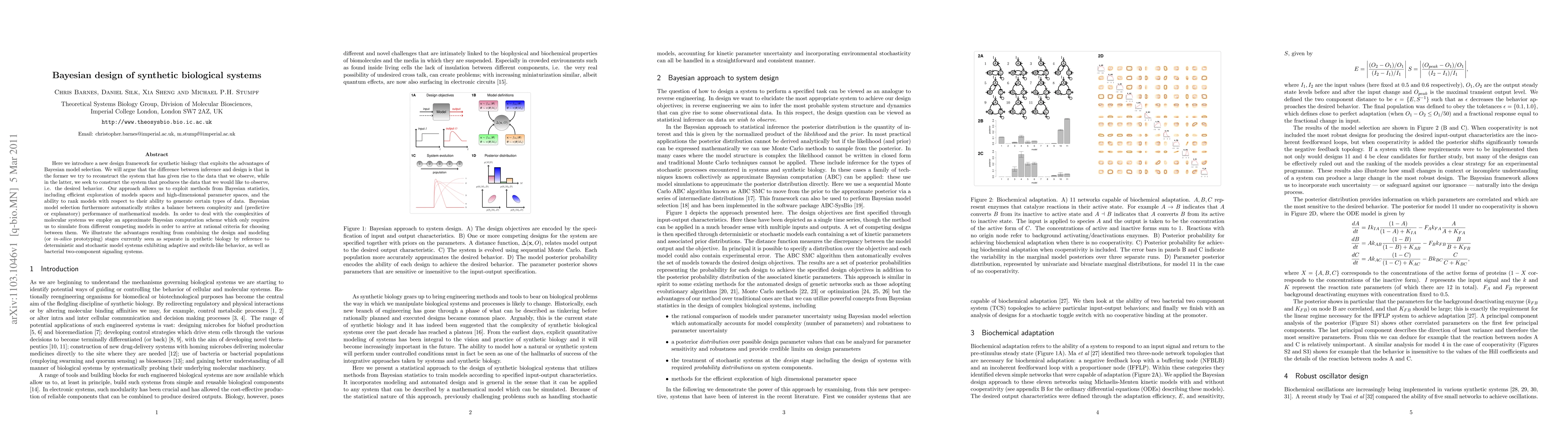 Here we introduce a new design framework for synthetic biology that exploits the advantages of Bayesian model selection. We will argue that the difference between inference and design is that in the former we try to reconstruct the system that has given rise to the data that we observe, while in the latter, we seek to construct the system that produces the data that we would like to observe, i.e. the desired behavior. Our approach allows us to exploit methods from Bayesian statistics, including efficient exploration of models spaces and high-dimensional parameter spaces, and the ability to rank models with respect to their ability to generate certain types of data. Bayesian model selection furthermore automatically strikes a balance between complexity and (predictive or explanatory) performance of mathematical models. In order to deal with the complexities of molecular systems we employ an approximate Bayesian computation scheme which only requires us to simulate from different competing models in order to arrive at rational criteria for choosing between them. We illustrate the advantages resulting from combining the design and modeling (or in-silico prototyping) stages currently seen as separate in synthetic biology by reference to deterministic and stochastic model systems exhibiting adaptive and switch-like behavior, as well as bacterial two-component signaling systems.