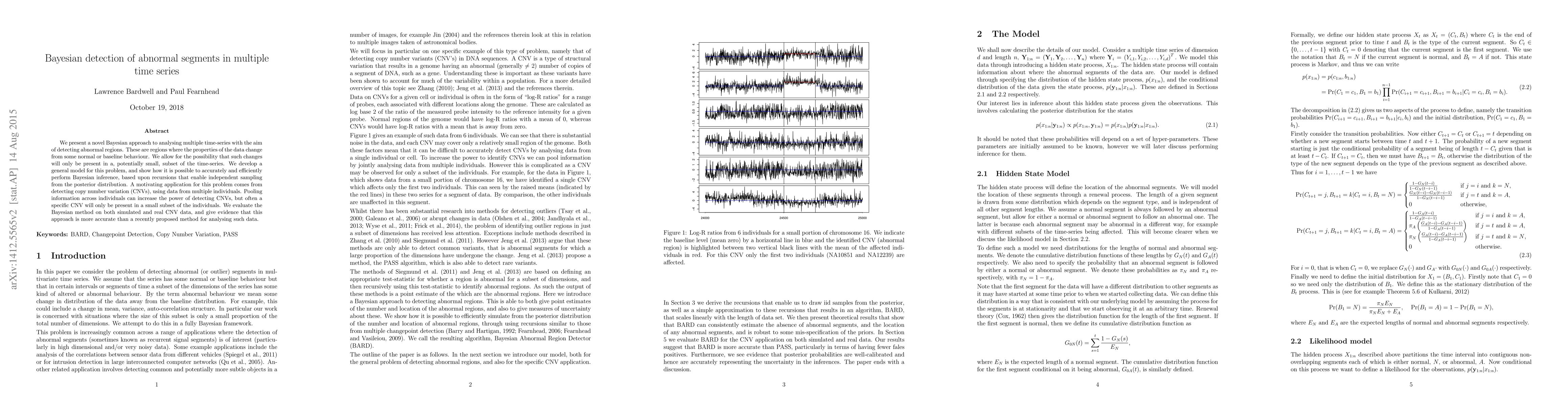 This research introduces a Bayesian method for detecting anomalous segments in multiple time-series, applicable to various fields including genomics for copy number variation (CNV) detection. The approach efficiently performs Bayesian inference, outperforming existing methods, especially when anomalies are present in a small subset of time-series.