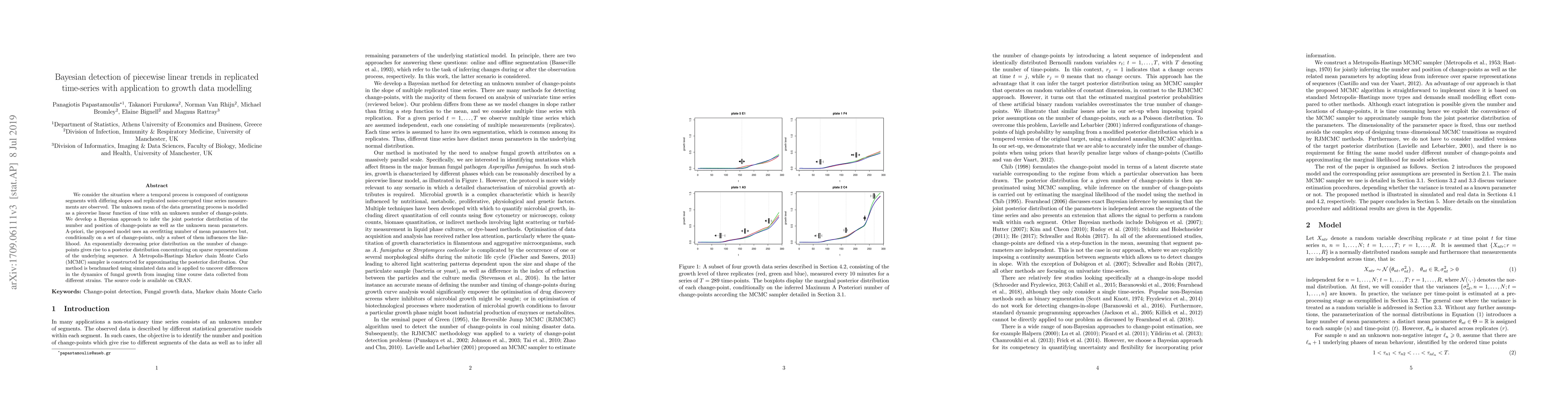 This research introduces a Bayesian method to detect changes in linear trends within replicated, noise-corrupted time-series data, particularly useful for modeling growth data. It uses a piecewise linear model with unknown change-points and parameters, employing a sparse prior to favor simpler models. The method, validated via simulations and applied to fungal growth imaging data, is implemented as an R package available on CRAN.