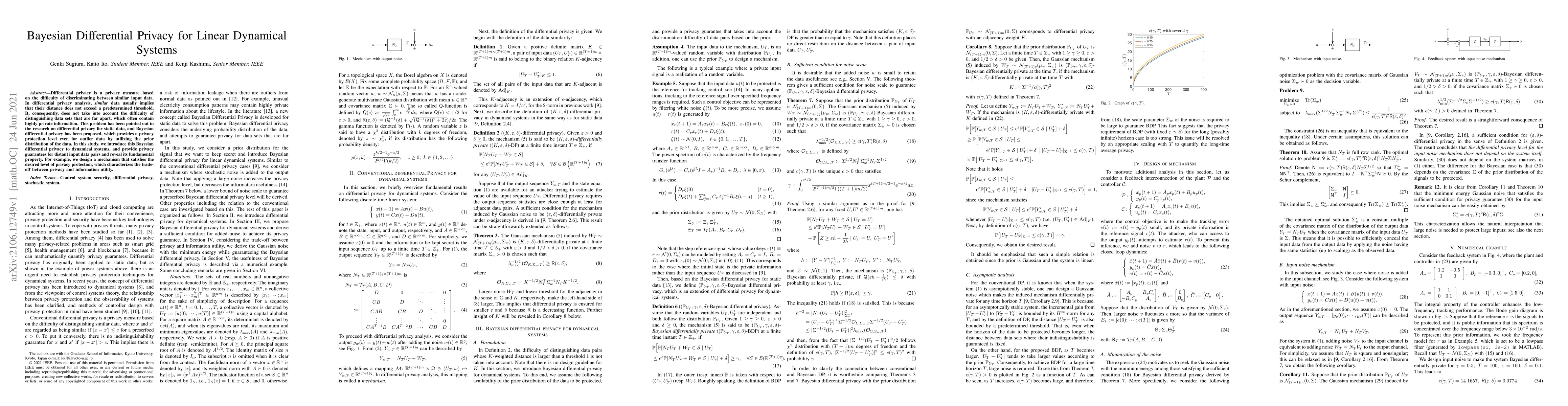 This paper introduces Bayesian differential privacy to linear dynamical systems, extending the concept to provide robust privacy guarantees for data pairs that are far apart, leveraging prior distribution to protect outlier data. It designs a mechanism that balances privacy and information utility effectively.