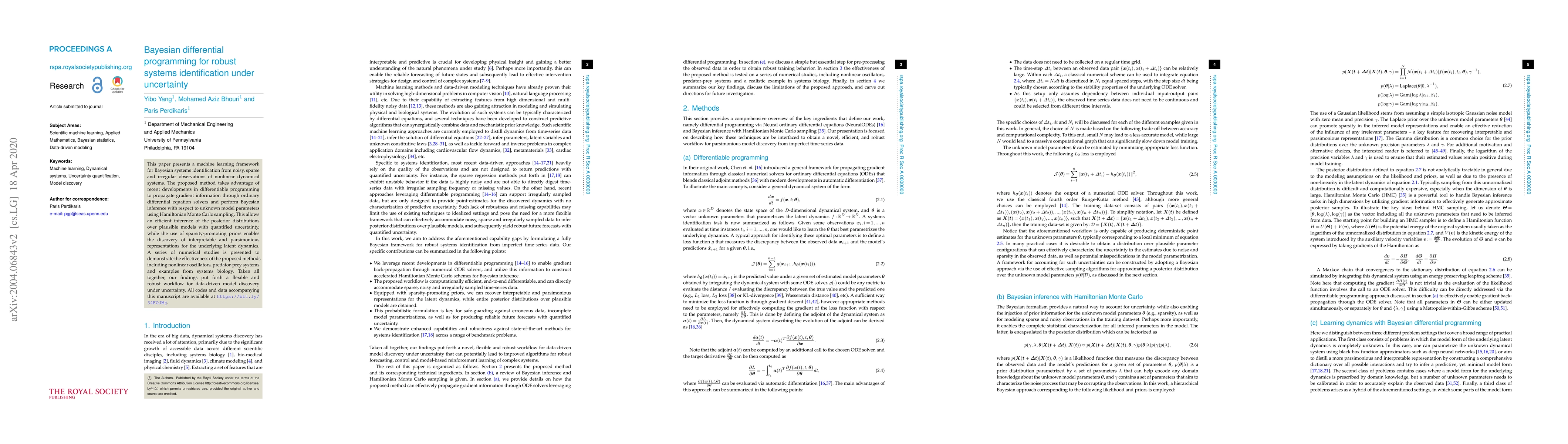 This paper introduces a Bayesian machine learning framework for identifying nonlinear dynamical systems from noisy, sparse data using differentiable programming and Hamiltonian Monte Carlo. The method efficiently infers model parameters and quantifies uncertainty, providing robust and interpretable system representations.